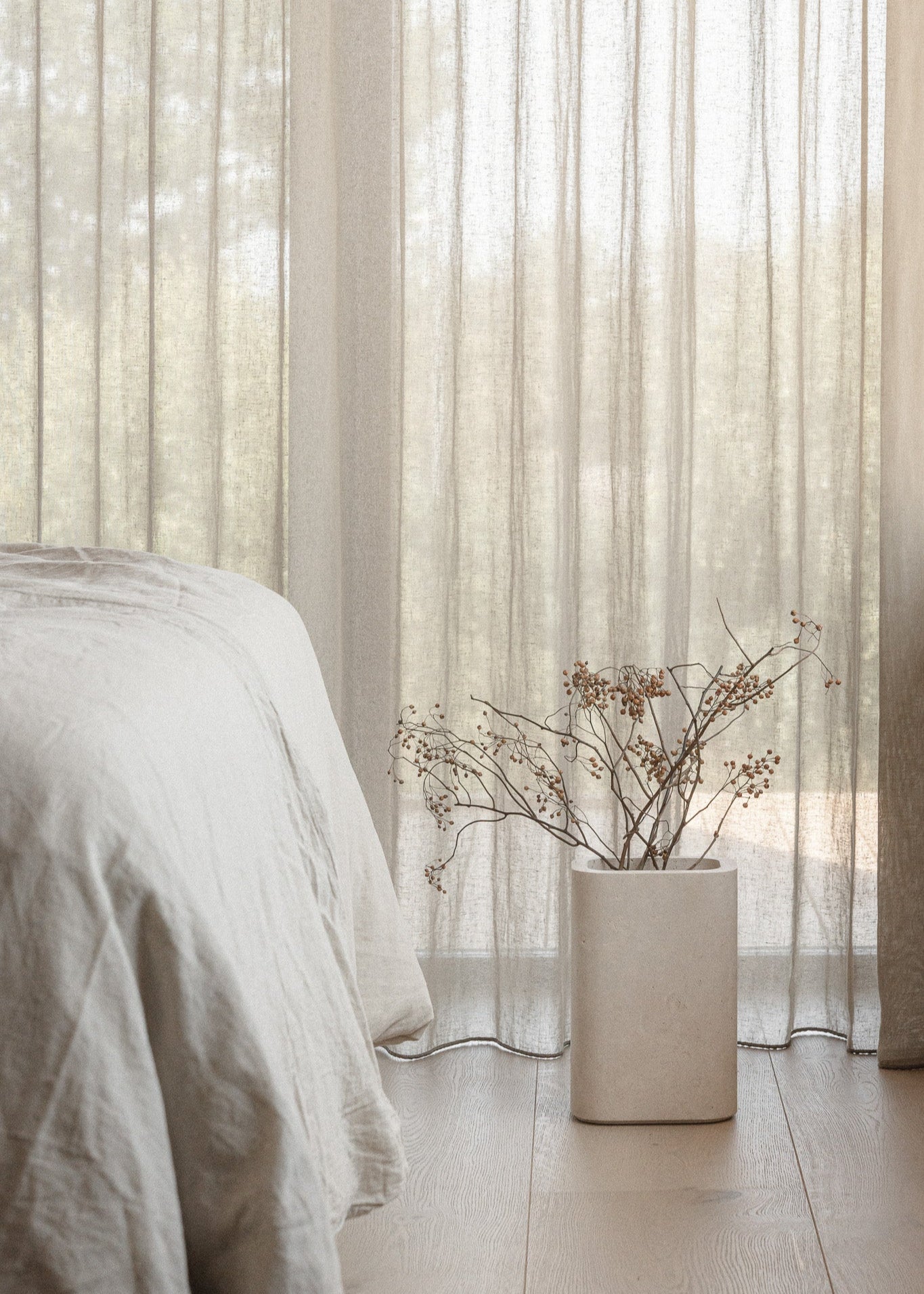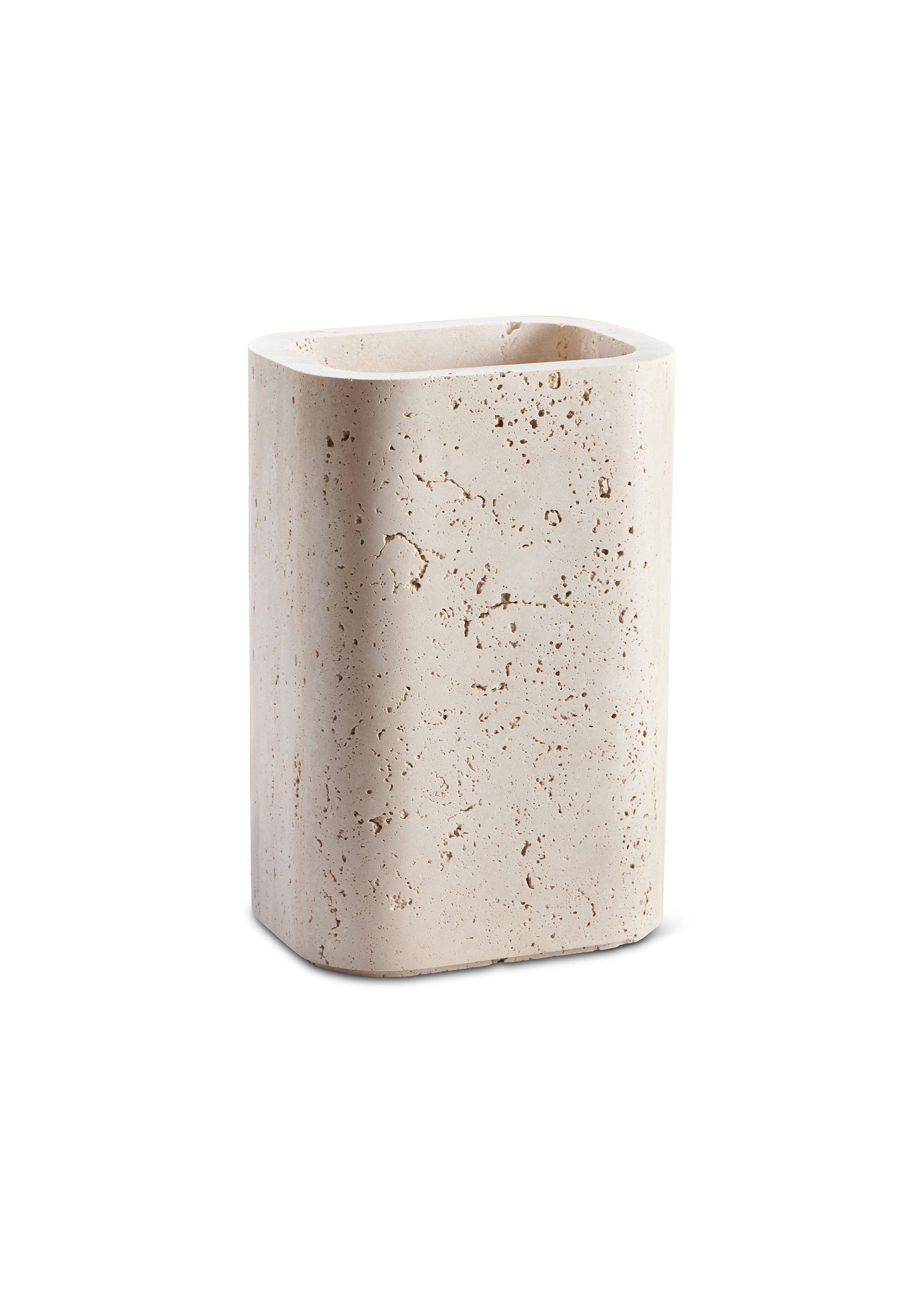 This vase is handcrafted from elegant European travertine limestone. The beautiful beige tones create a natural play of texture on the surface, making each stone unique. All natural holes in the stone are preserved, giving the vase a raw and authentic expression. Every vase is one of a kind, exuding understated elegance and exceptional craftsmanship.