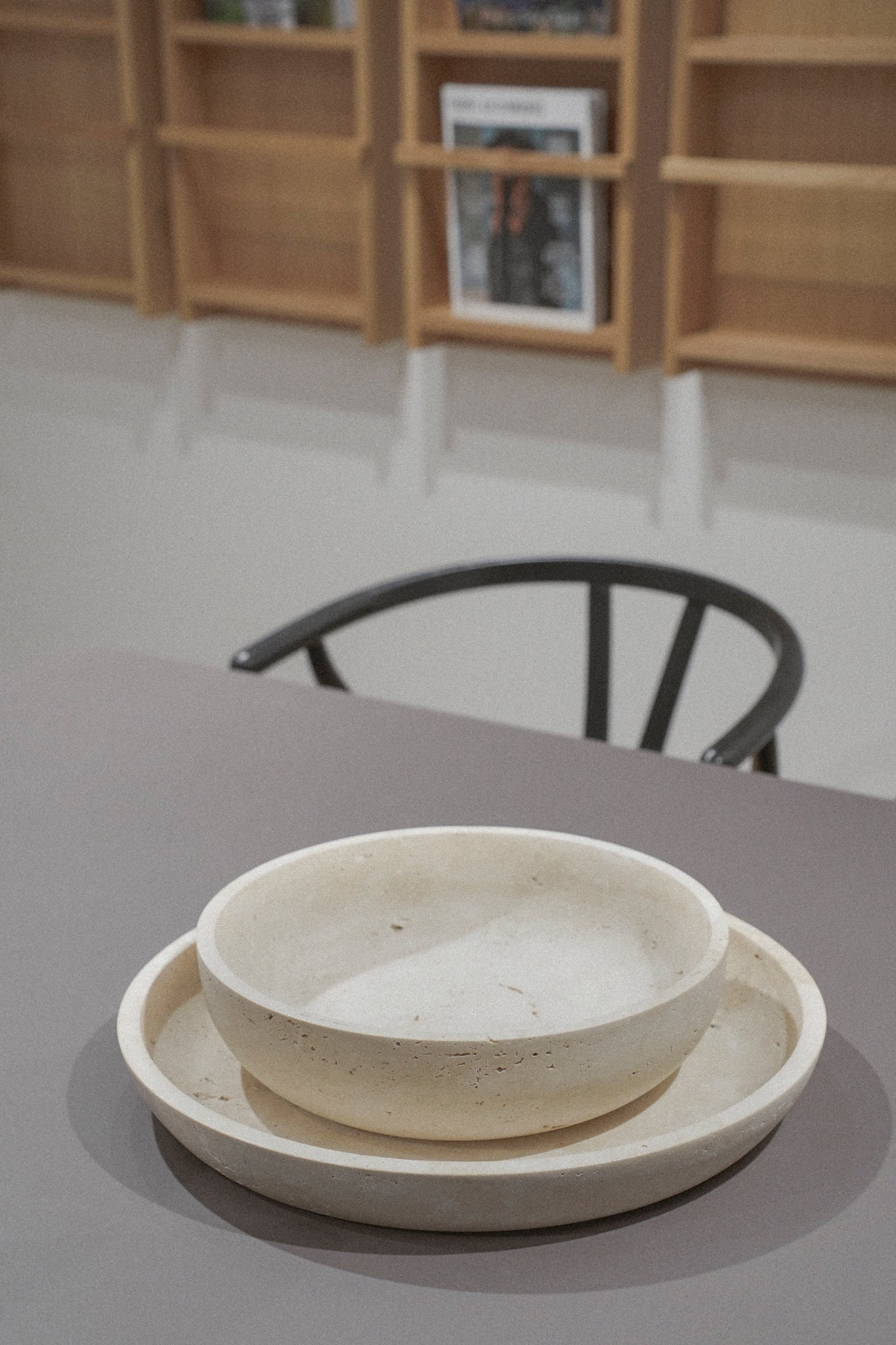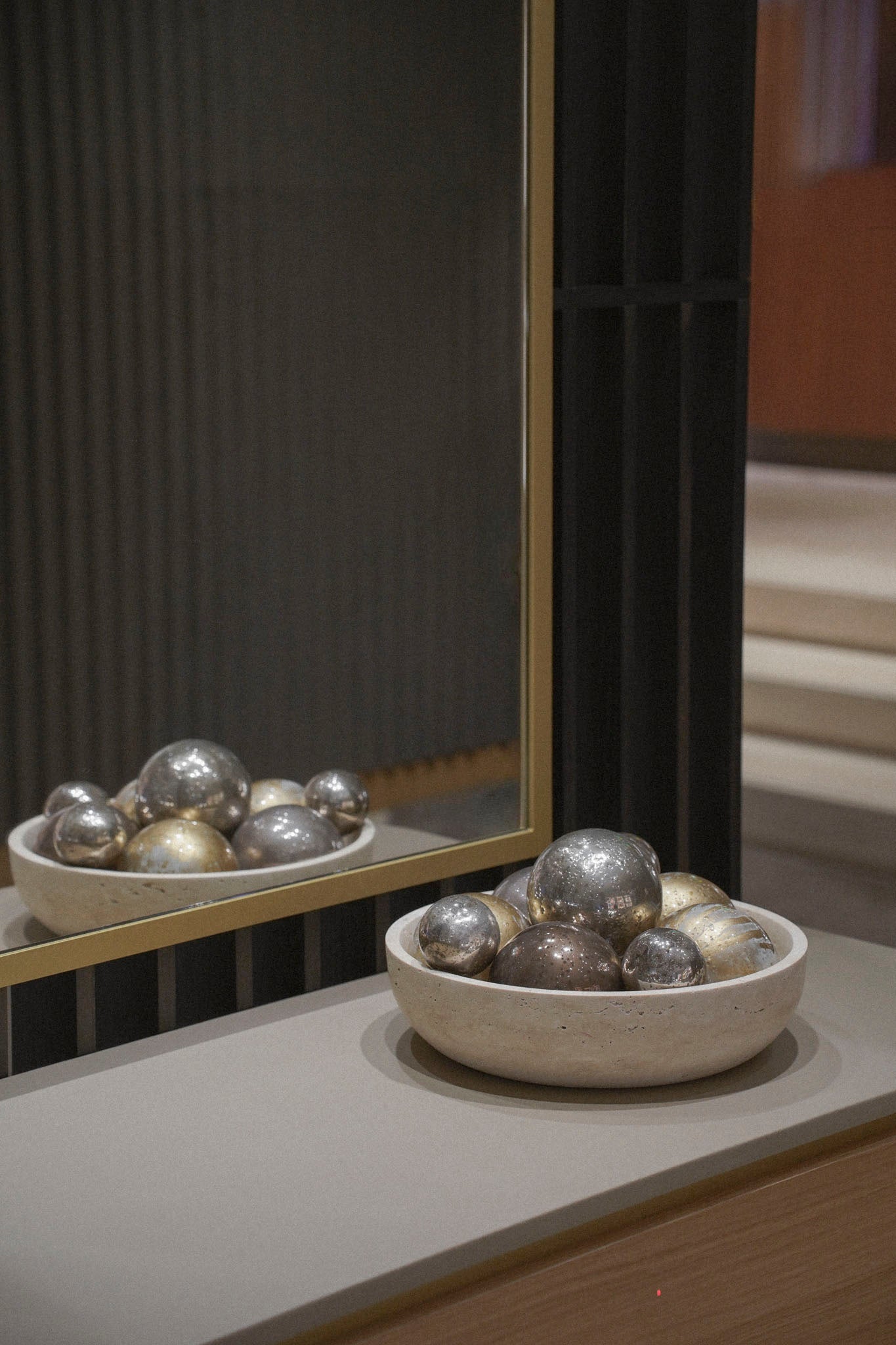 Hybens rene form og taktile overflade er et oplagt element i et rum som Knud Pedersen, hvor eksklusive ure og smykker spiller en central rolle. Skålen står tit alene i butikken , som et æstetisk statement, men nogle gange bruges den også dekorativt – eksempelvis med chokolade, sæsonens naturmaterialer eller julekugler.