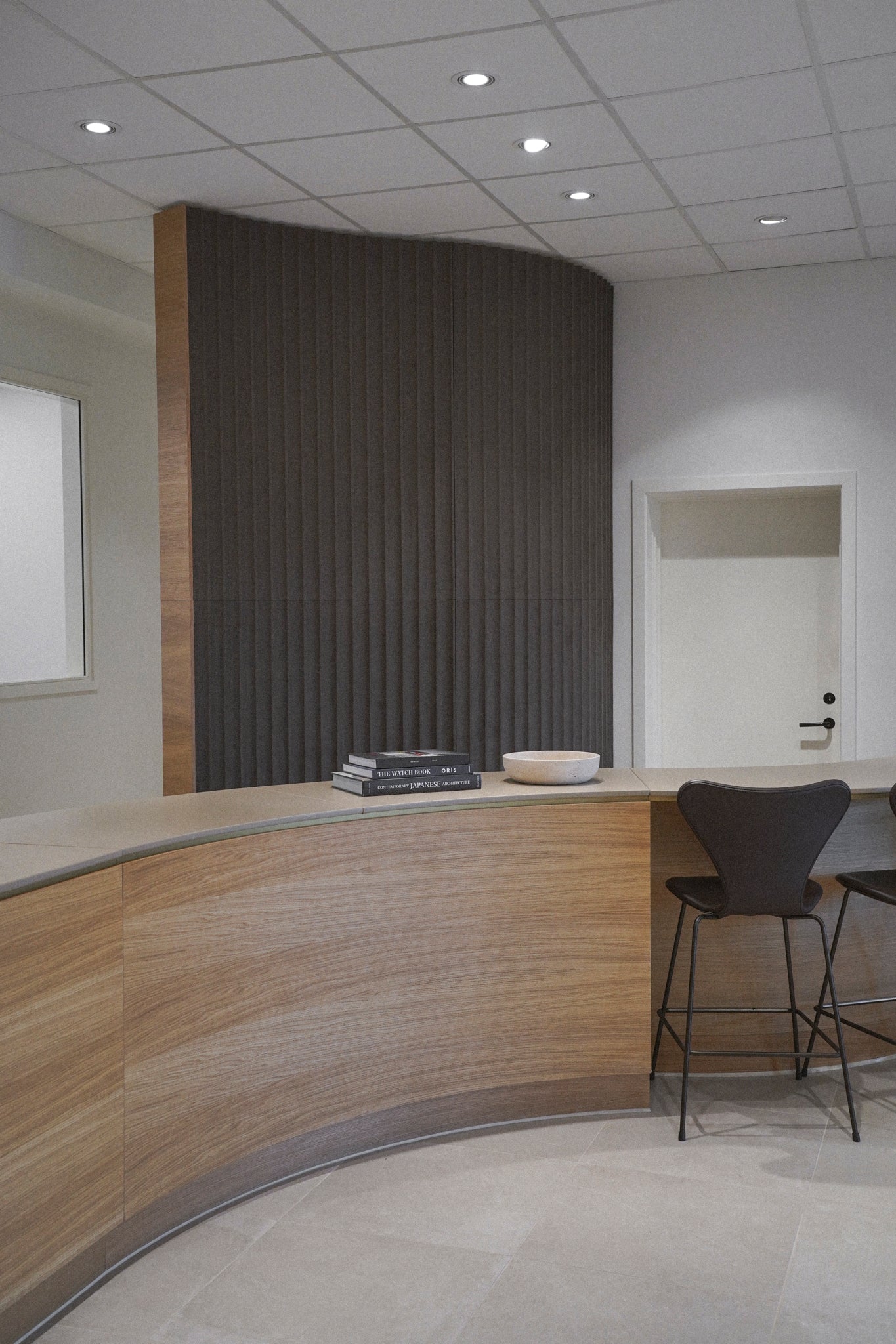 Når man træder ind i Knud Pedersens butik, mødes man af en rolig og gennemført atmosfære, hvor materialevalg og æstetik er nøje afstemt. Butikkens eksklusive urafdeling er beklædt med smuk travertin på både vægge og gulve – et naturmateriale, der udstråler tidløshed, elegance og taktil varme. Derfor var det oplagt at introducere to af vores egne travertin-objekter i rummet: Hyben og Siv fra WABI SABI.