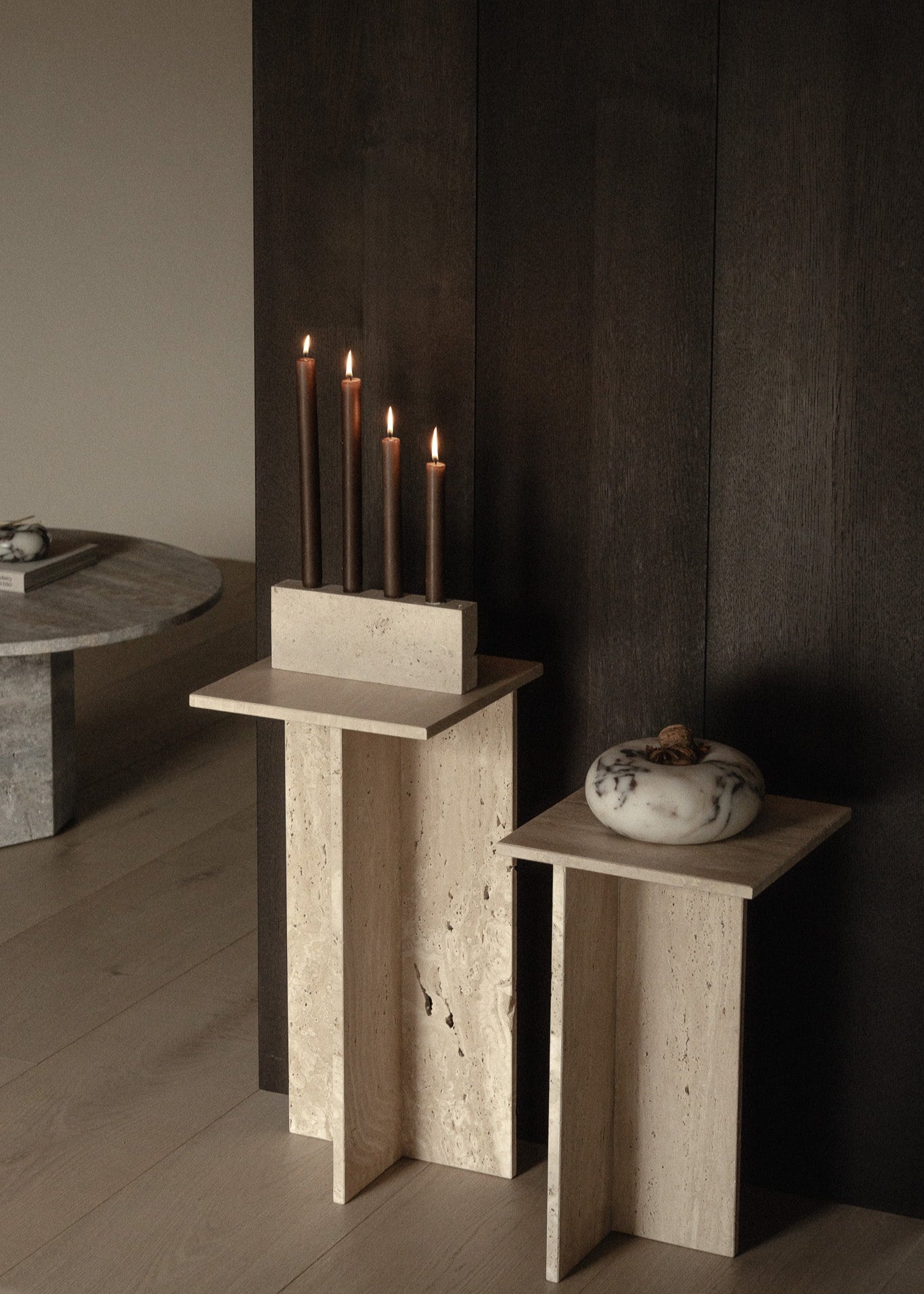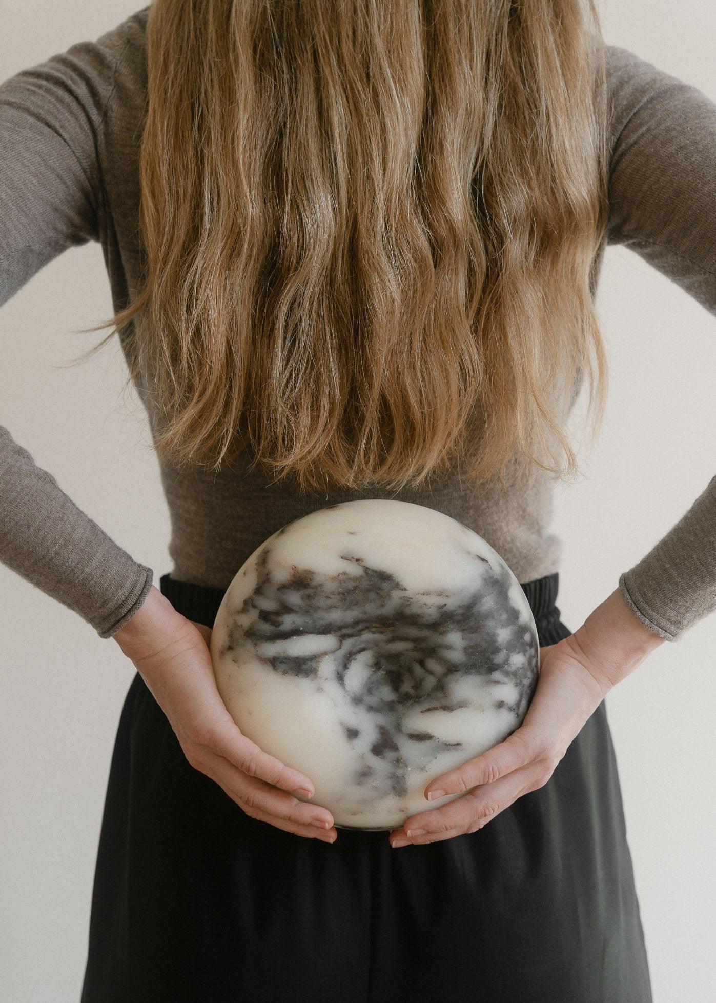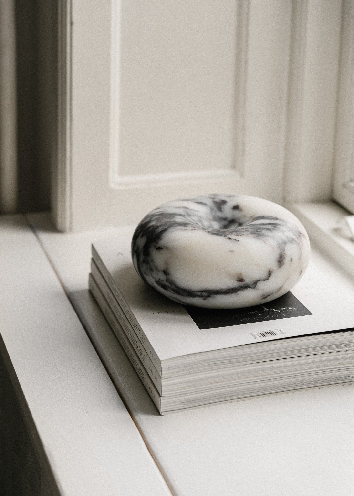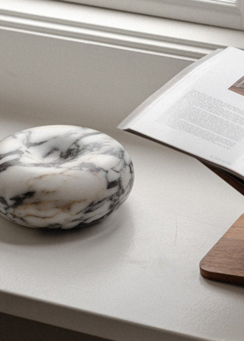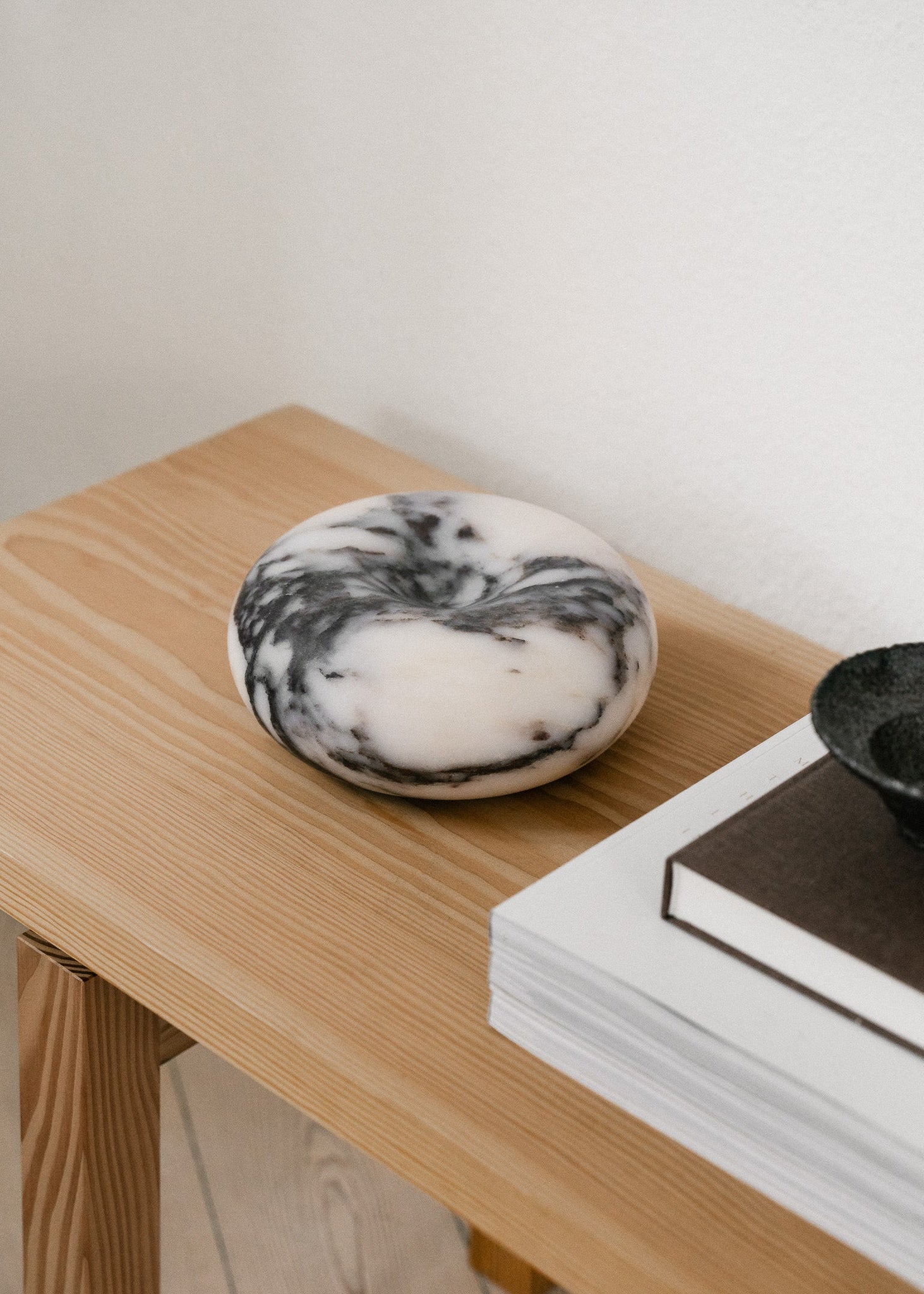 Cosmos svæver i grænselandet mellem brugsgenstand og kunstobjekt. Det runde buttede formsprog sætter marmor i et nyt blødere lys.