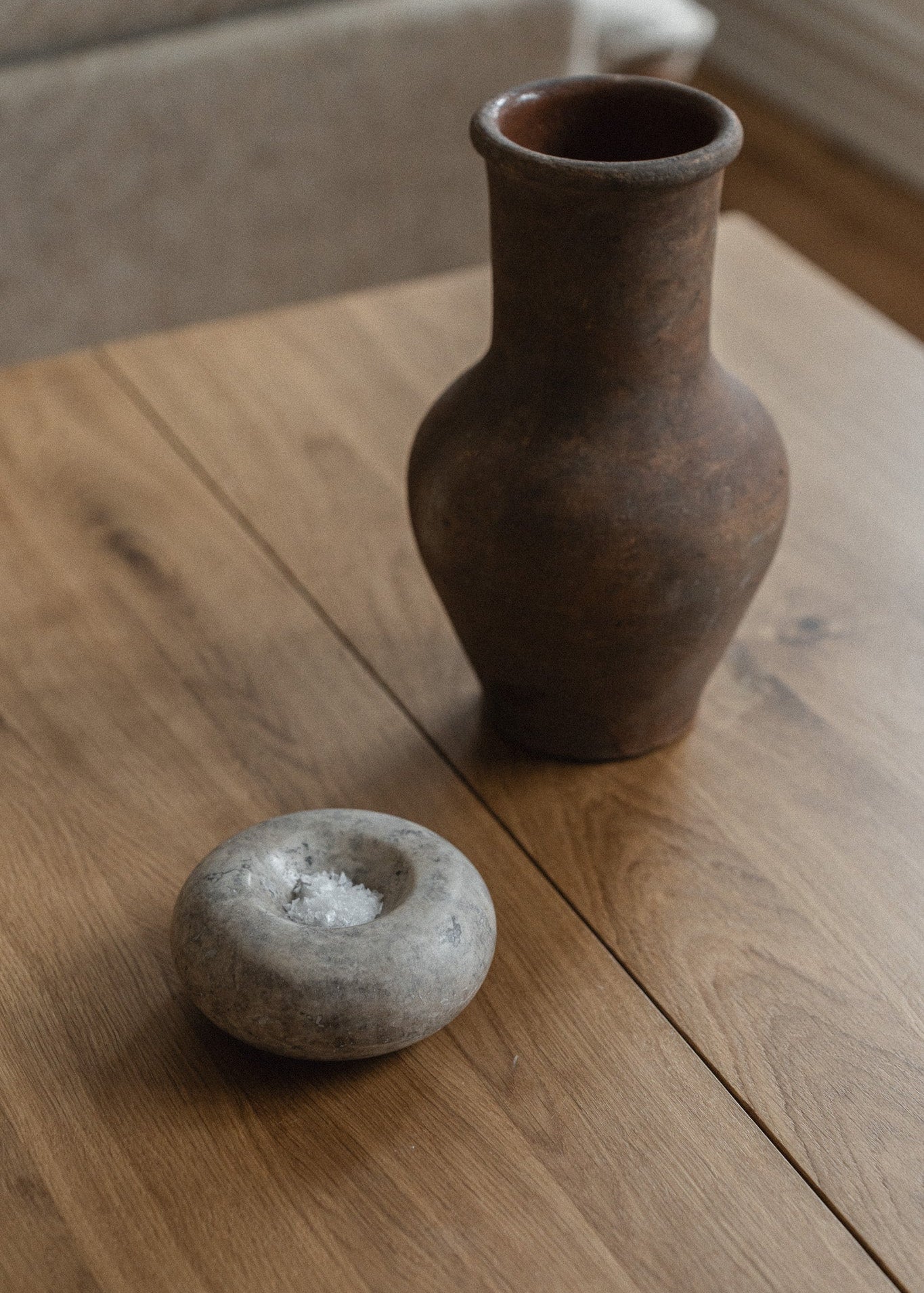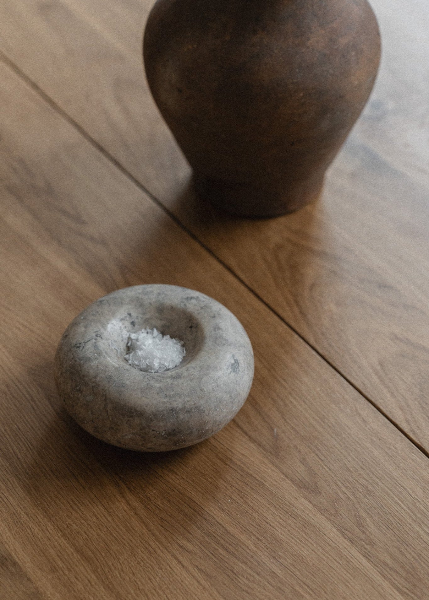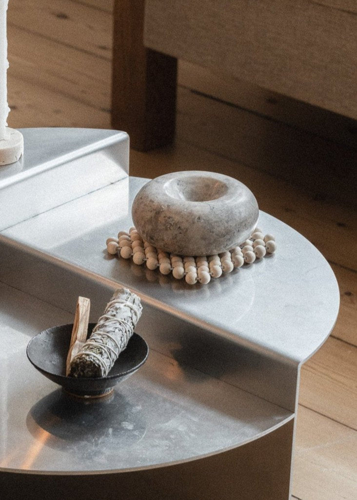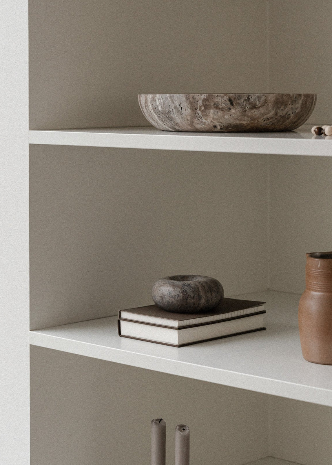 Cosmos svæver i grænselandet mellem brugsgenstand og kunstobjekt. Det runde buttede formsprog sætter travertinen i et nyt blødere lys.