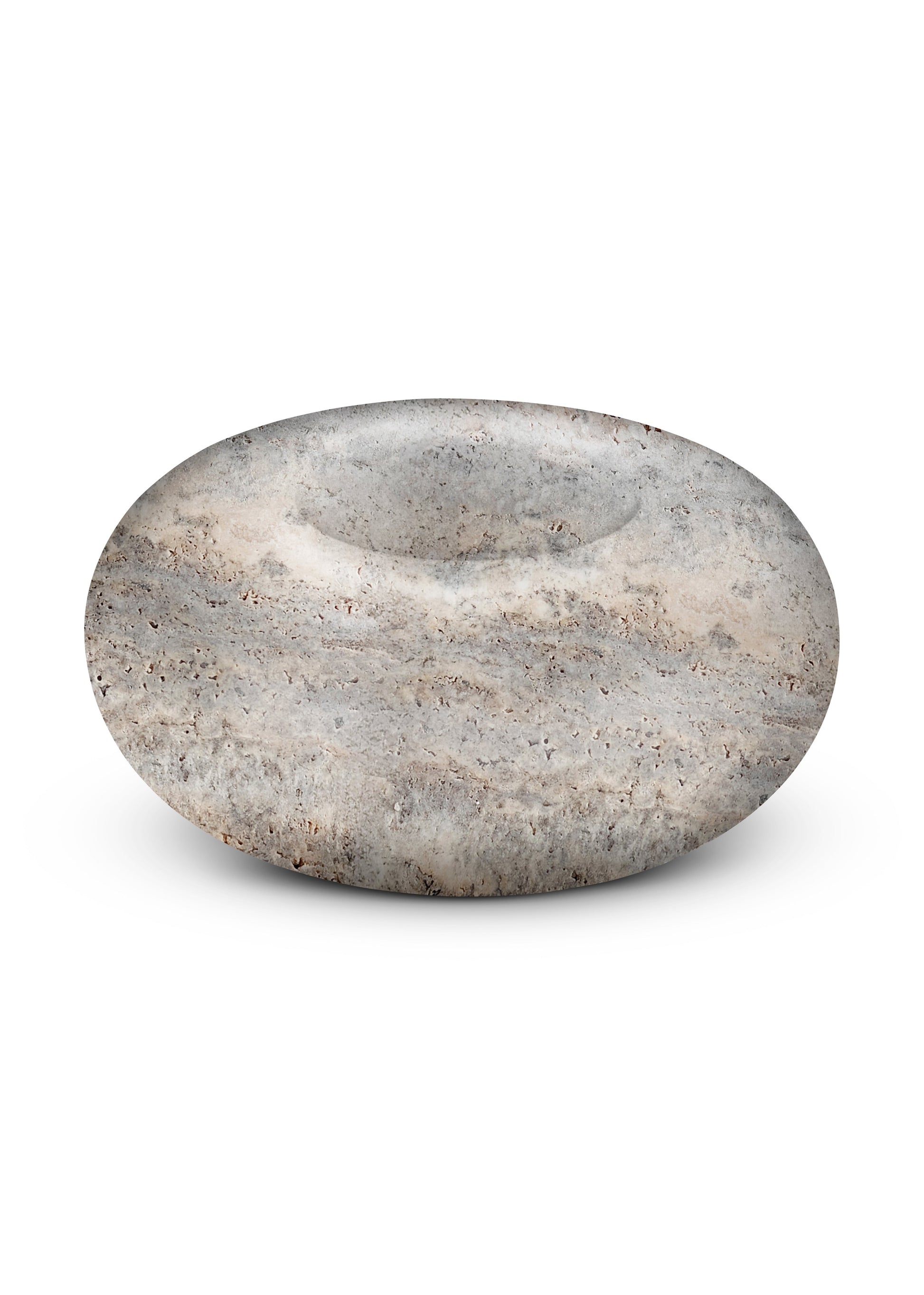 Dette objekt er lavet i den elegante kalksten Travertin Silver fra Europa. De grå og brune nuancer skaber en neutral baggrund, mens små, fine hvide glimt tilfører liv og dybde til overfladen.