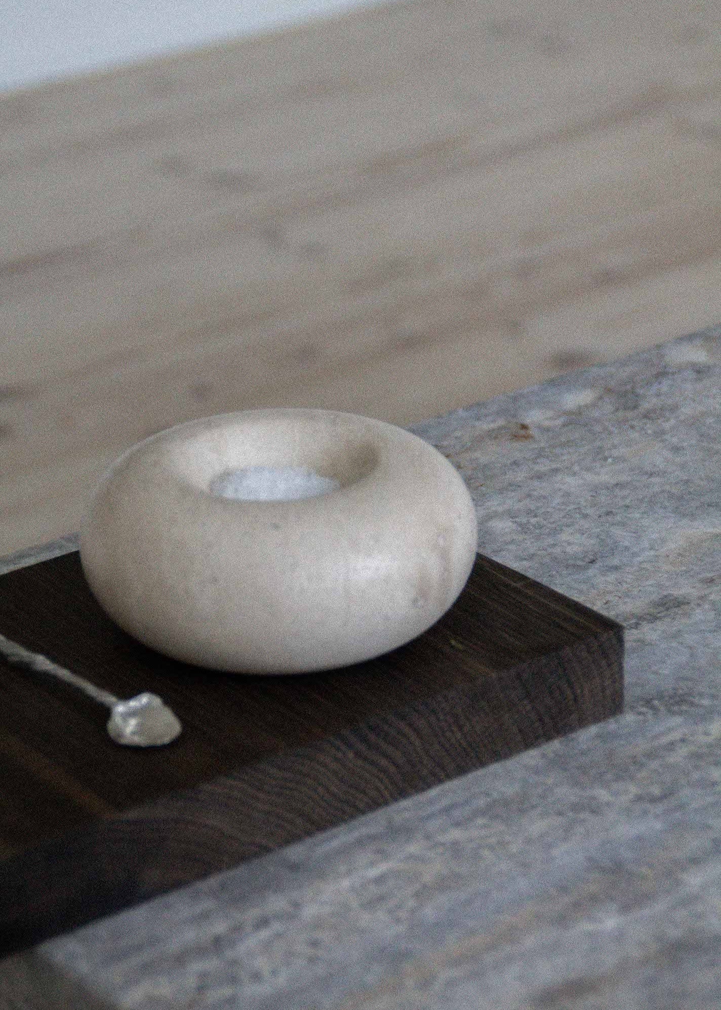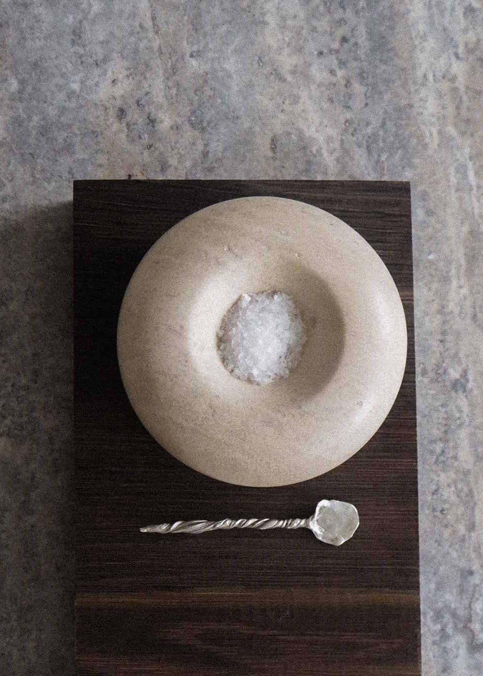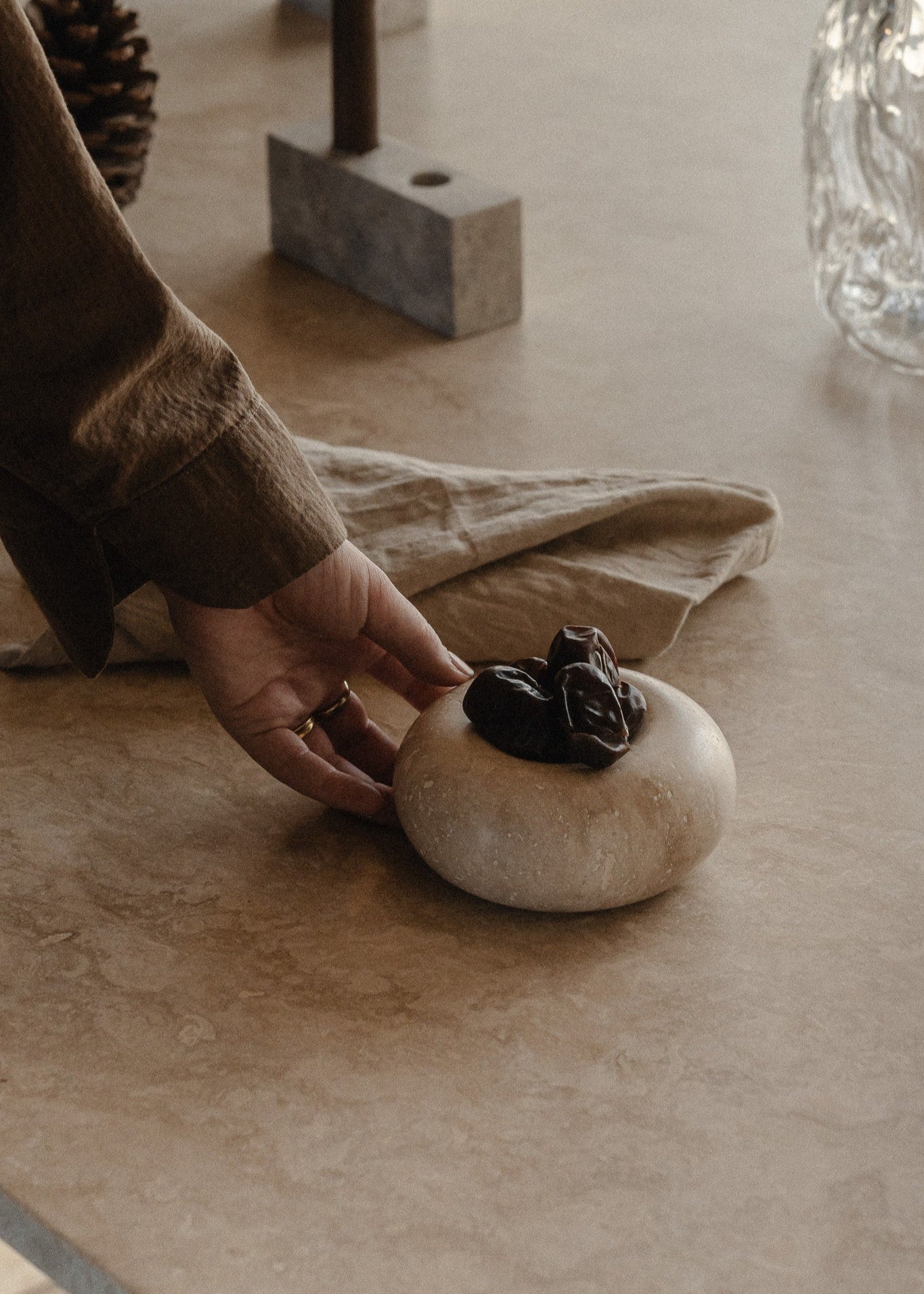 Cosmos svæver i grænselandet mellem brugsgenstand og kunstobjekt. Det runde buttede formsprog sætter travertinen i et nyt blødere lys.