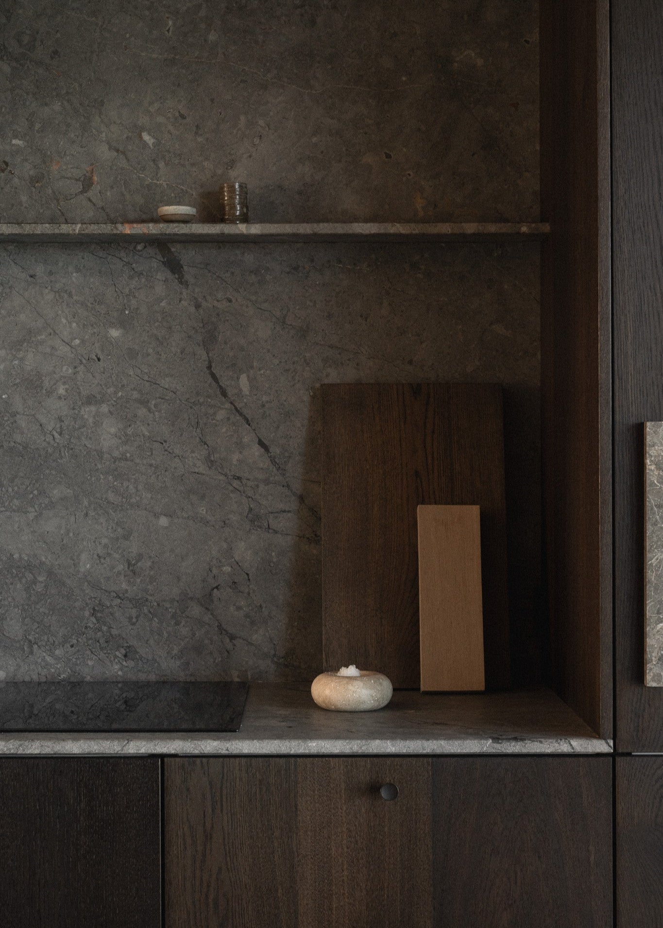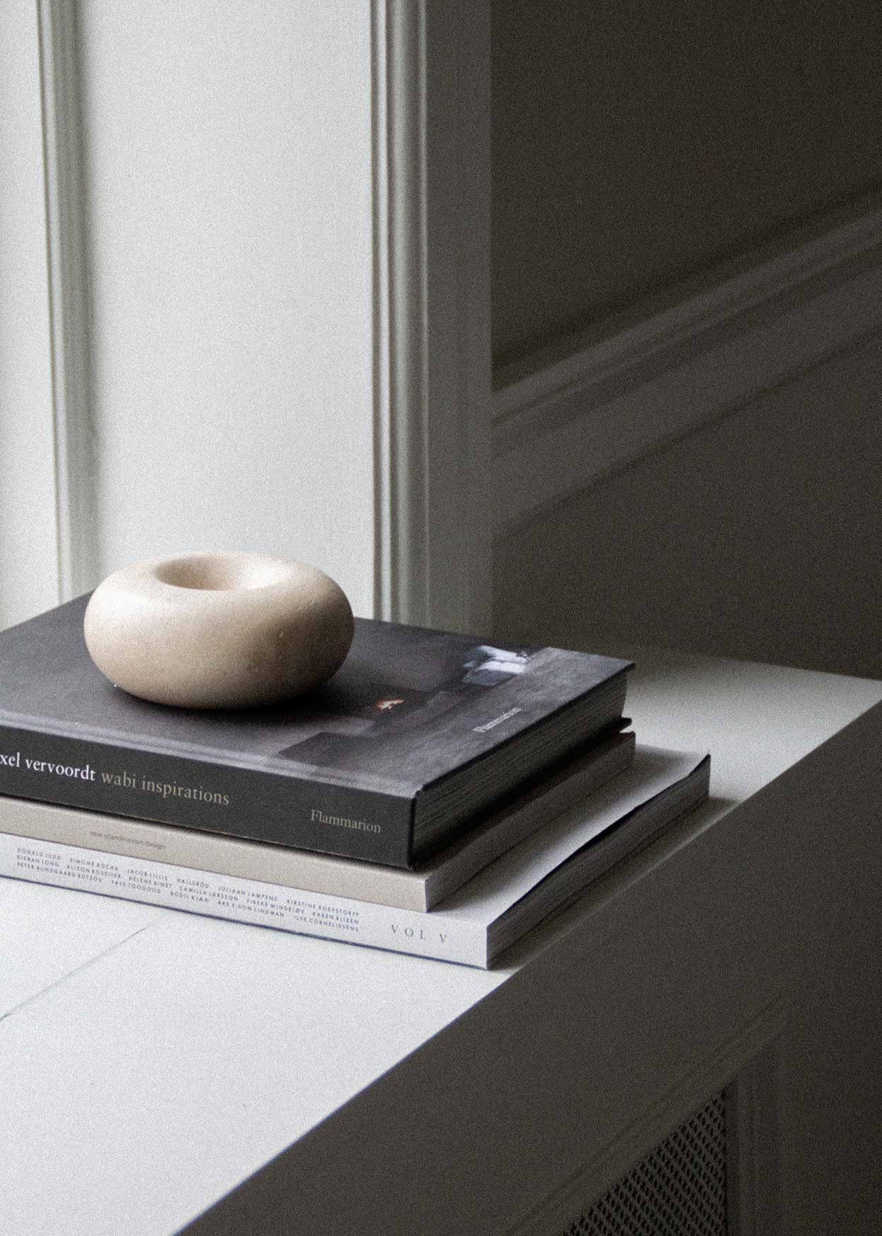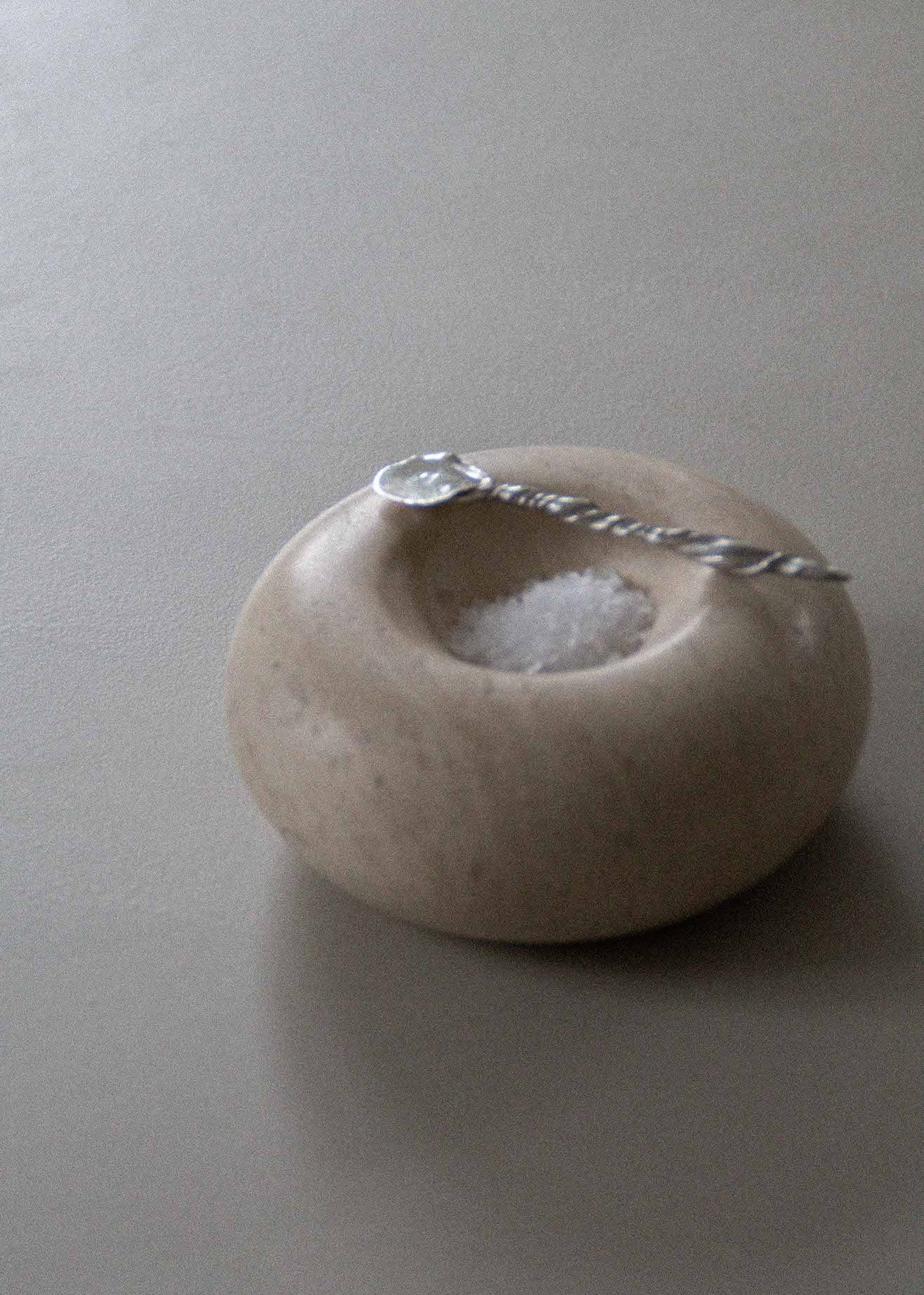 Cosmos svæver i grænselandet mellem brugsgenstand og kunstobjekt. Det runde buttede formsprog sætter travertinen i et nyt blødere lys.