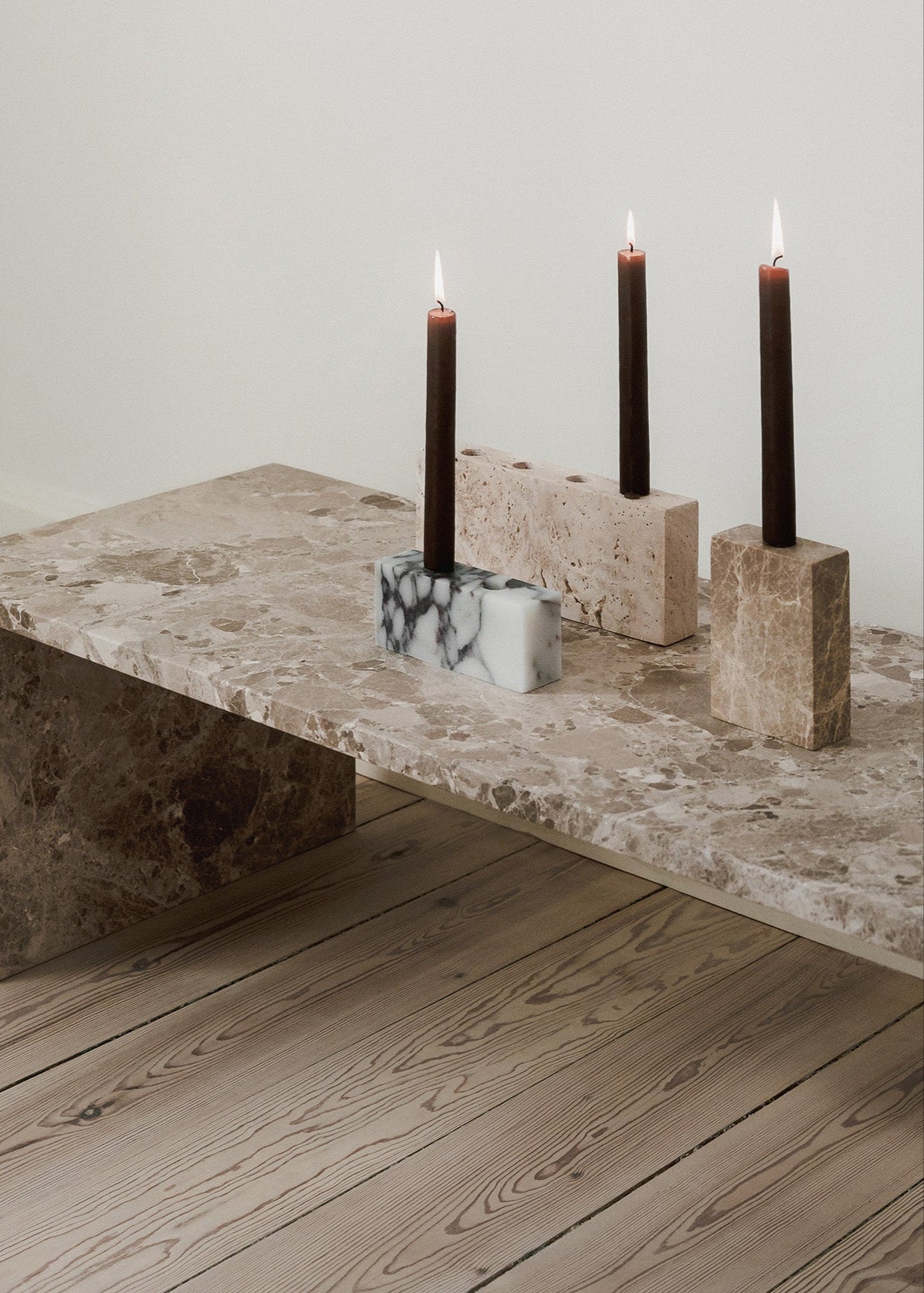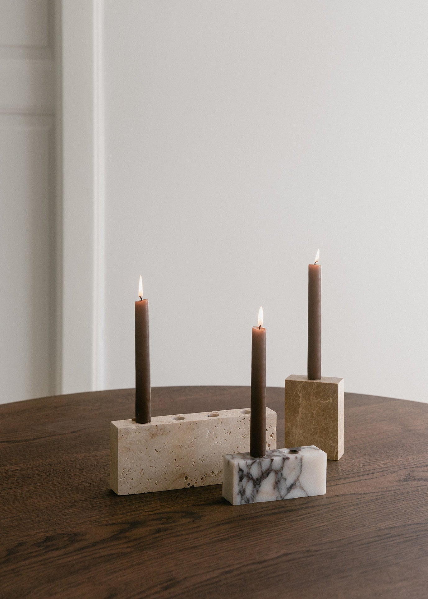 Epode er en lille serie af tre smukke lysestager i natursten, der tilsammen skaber et dynamisk spil mellem overflader, farver og dimensioner. En smuk treenighed.