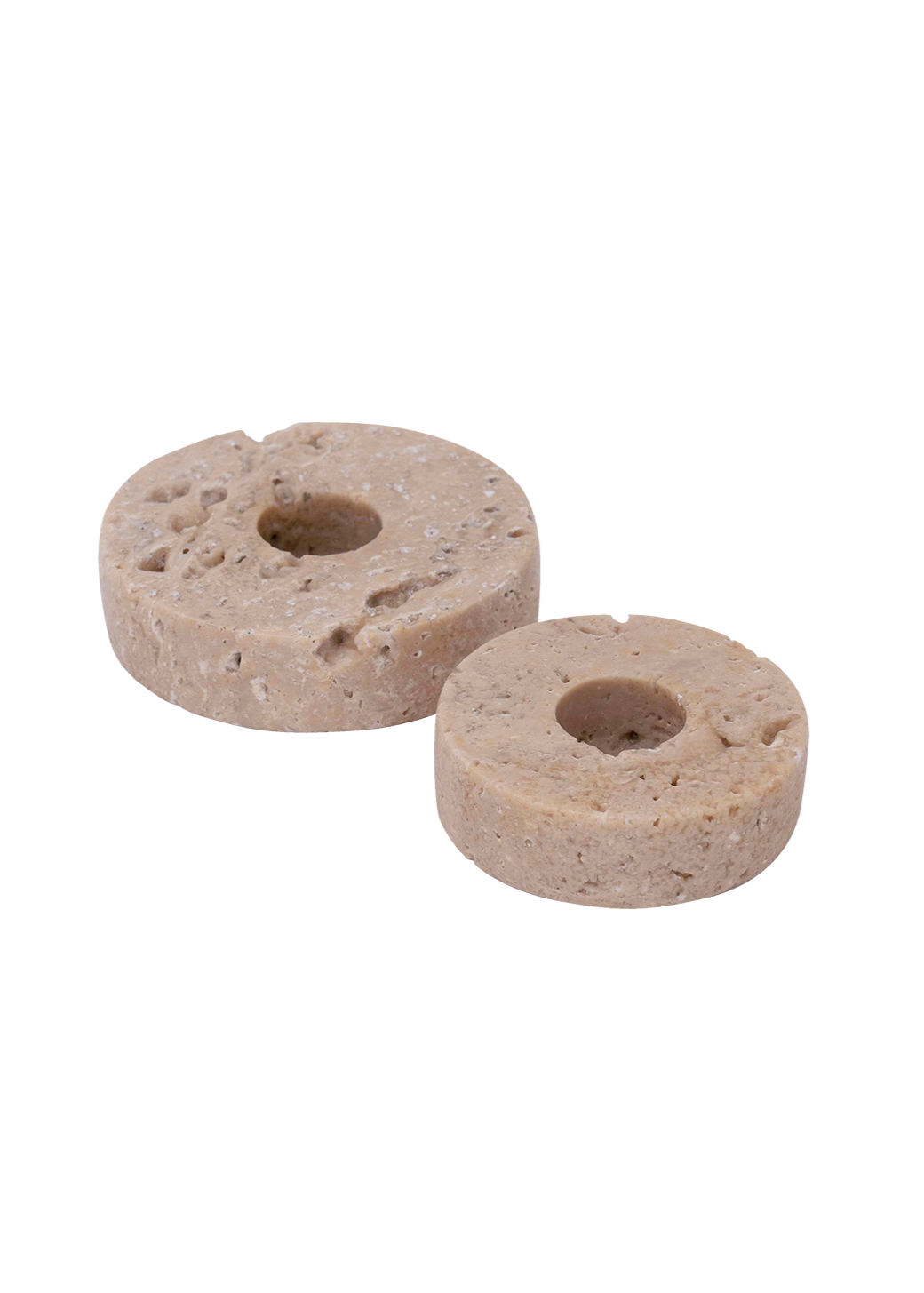 Denne lysestage er fremstillet i den smukke og robuste kalksten Travertin fra Europa. De smukke beige toner giver et naturligt spil i overfladen, der gør hver sten unik.