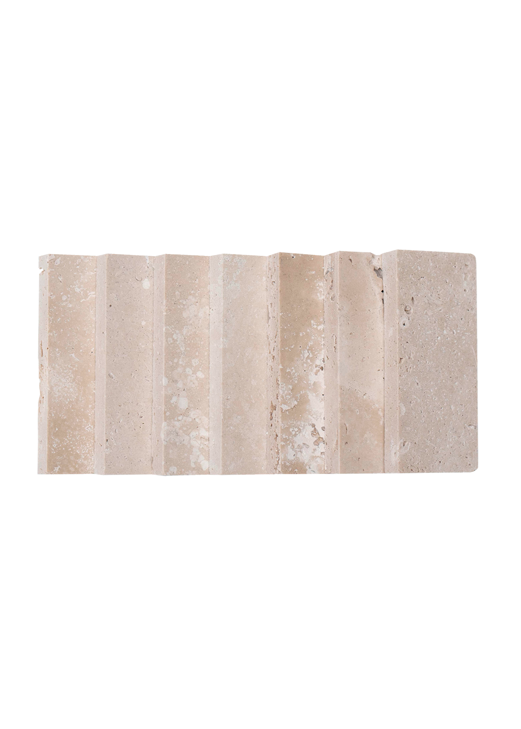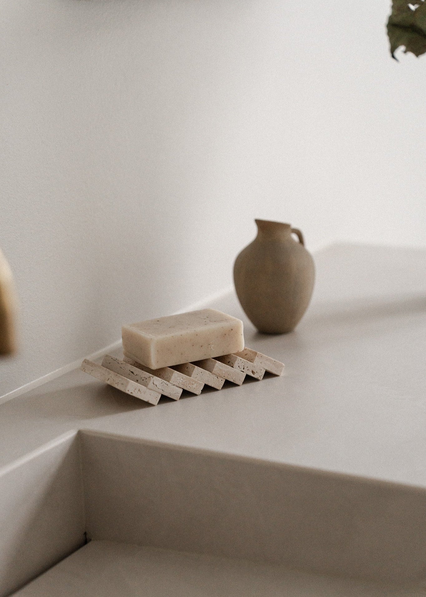 Sæberne kan både ligge fladt på risten eller stå op, hvilket skaber plads til flere barer og giver et elegant, levende look. Den robuste travertin med sine naturlige beige toner gør hver rist til et unikt lille kunstværk.