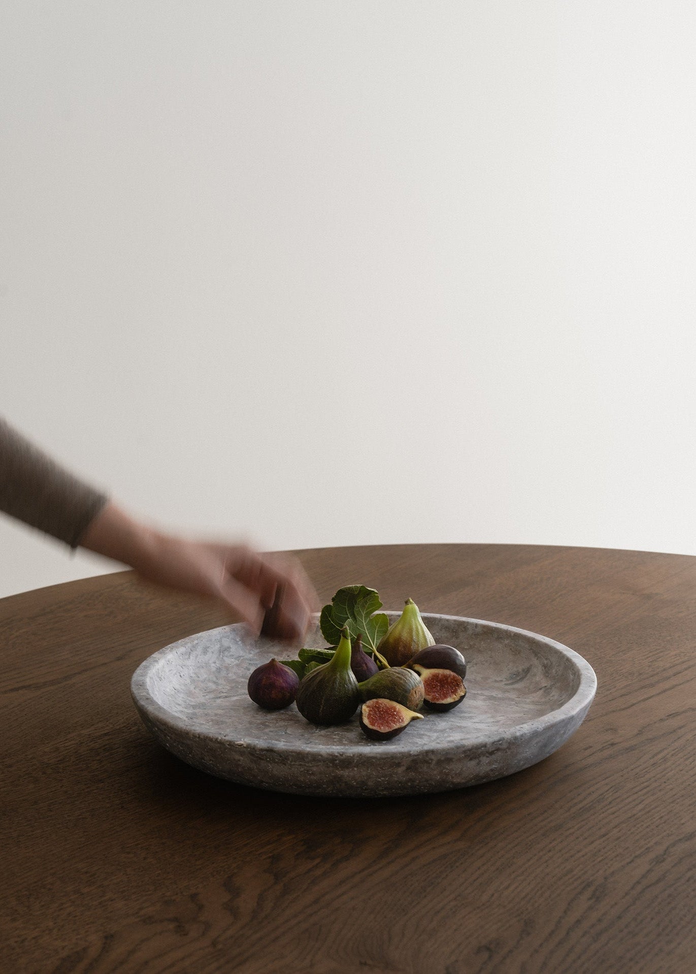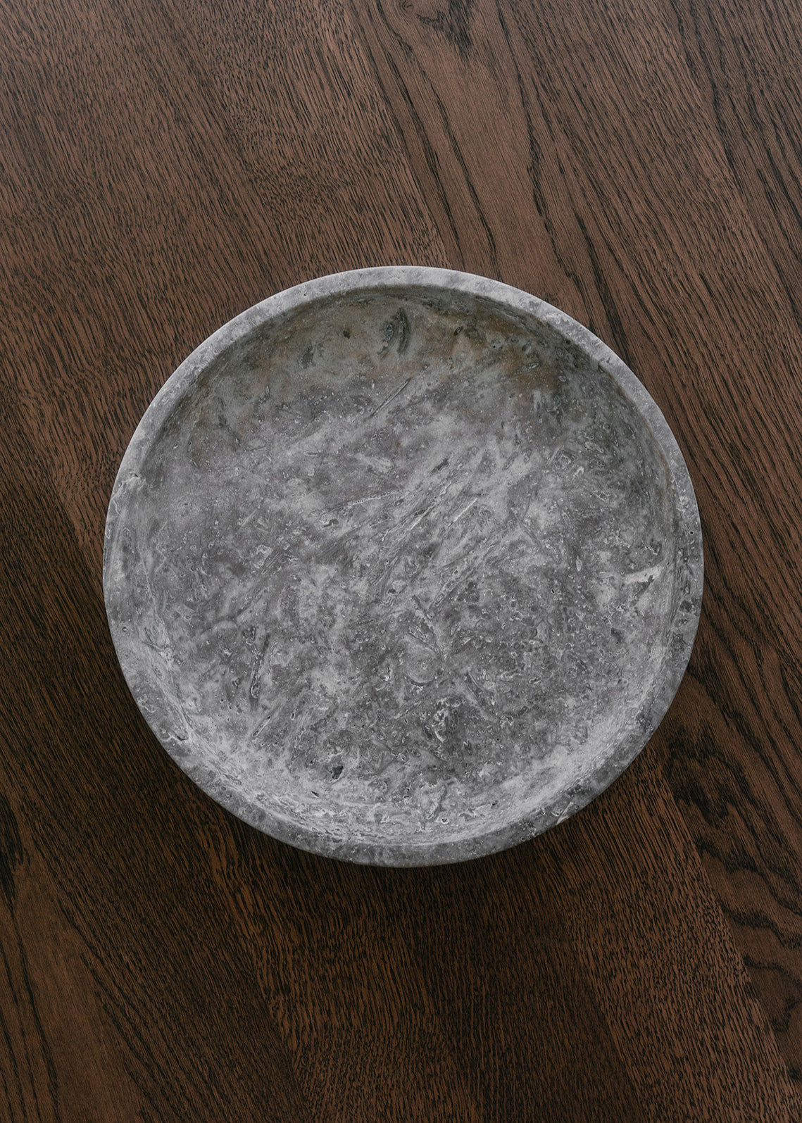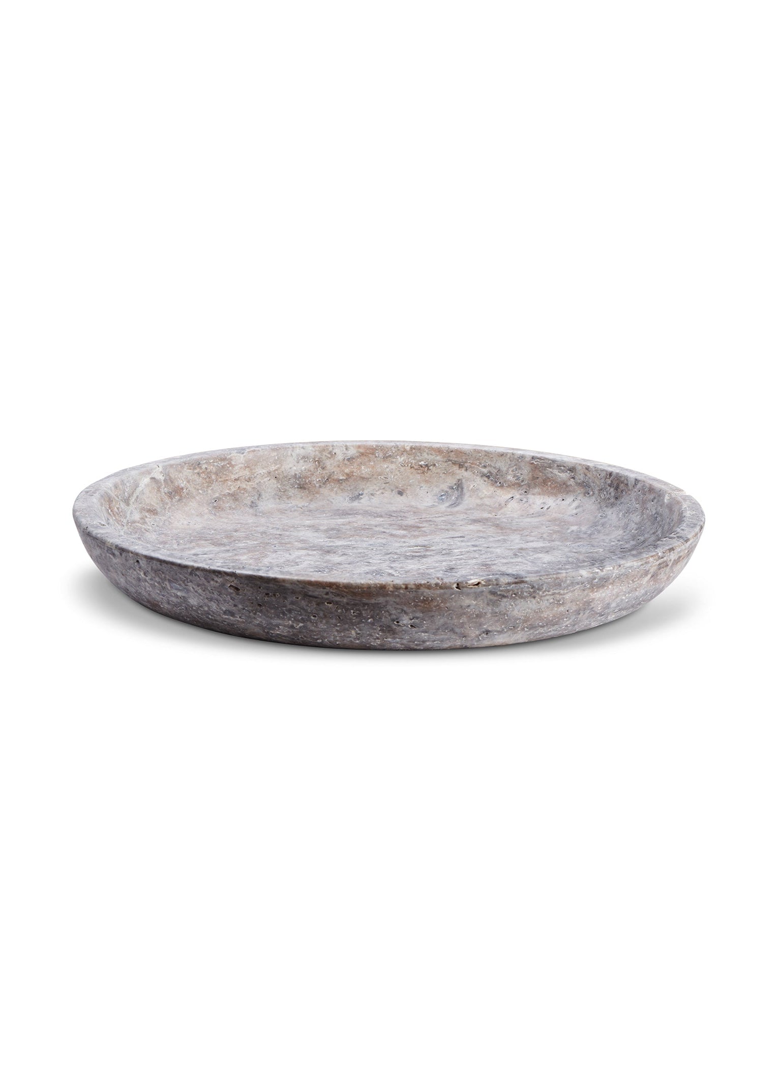 Skålen er håndlavet i den elegante kalksten travertin silver fra Europa. De grå og brune nuancer danner en neutral baggrund, mens små, fine hvide glimt tilfører liv og dybde til overfladen. De naturlige huller i stenen er bevaret, hvilket giver et råt og autentisk udtryk. Hver skål er unik og udstråler en underspillet elegance og stor håndværksmæssig finesse.