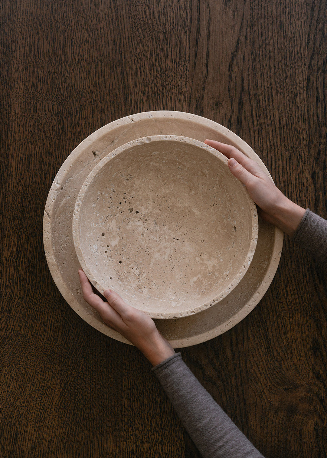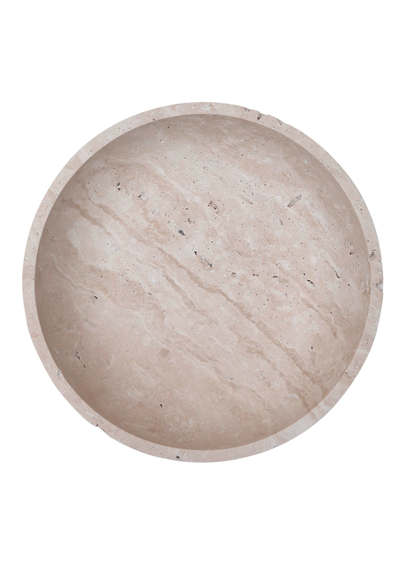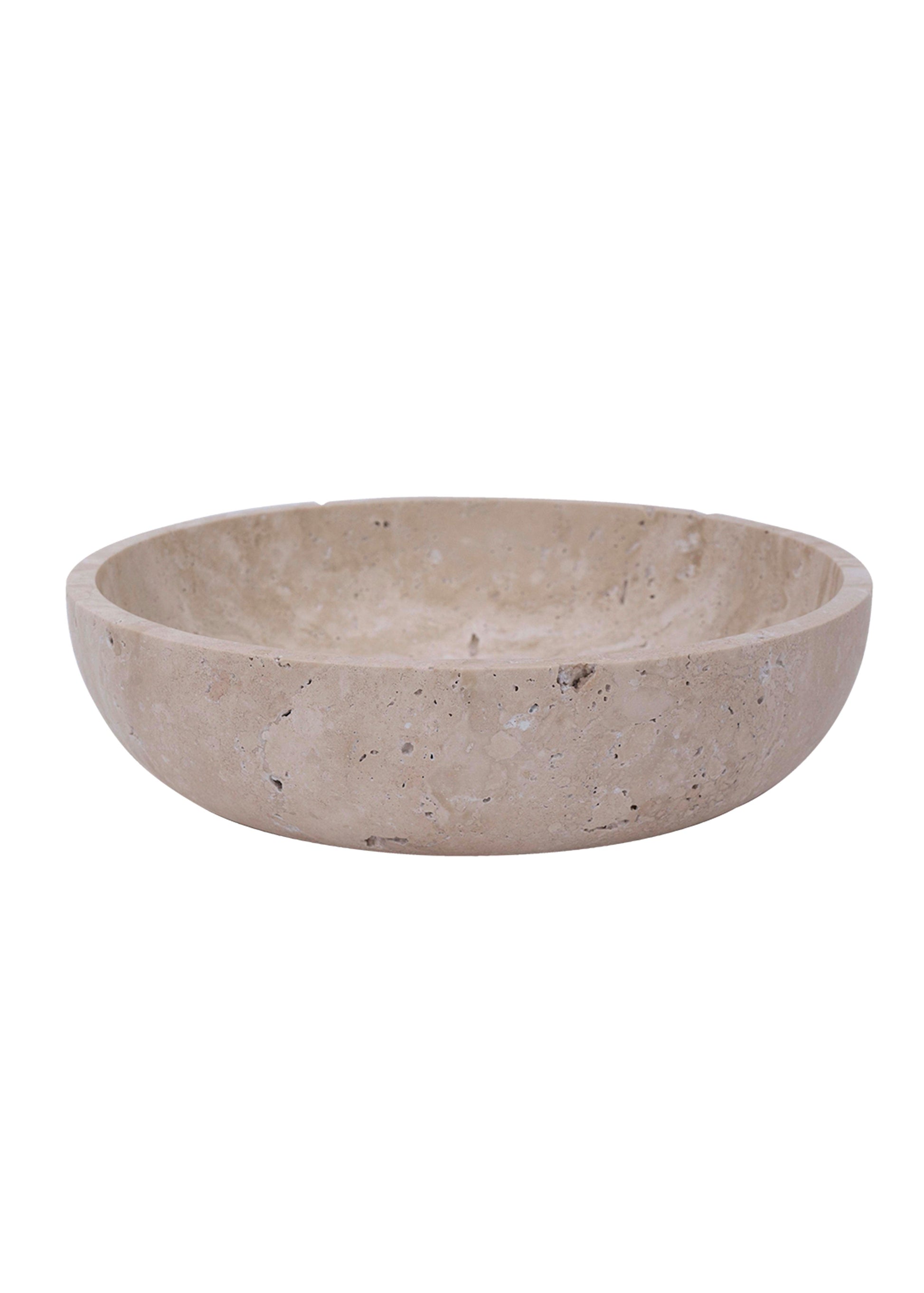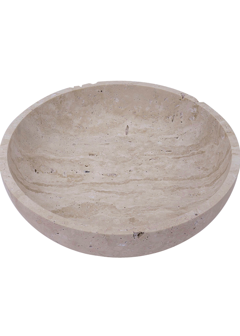 Skålen er håndlavet i den elegante kalksten Travertin fra Europa. De smukke beige toner giver et naturligt spil i overfladen, der gør hver sten unik. De naturlige huller i stenen er bevaret, hvilket giver et råt og autentisk udtryk. Hver skål er unik og udstråler en underspillet elegance og stor håndværksmæssig finesse.