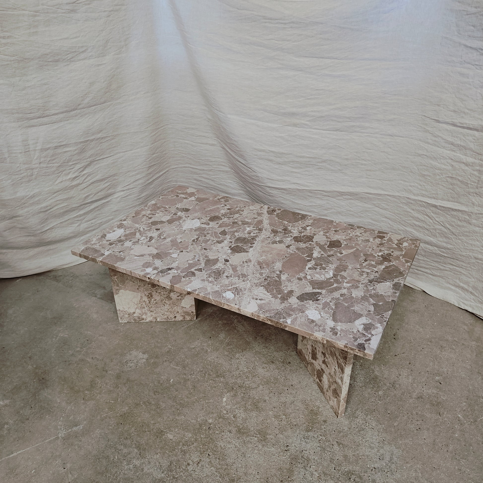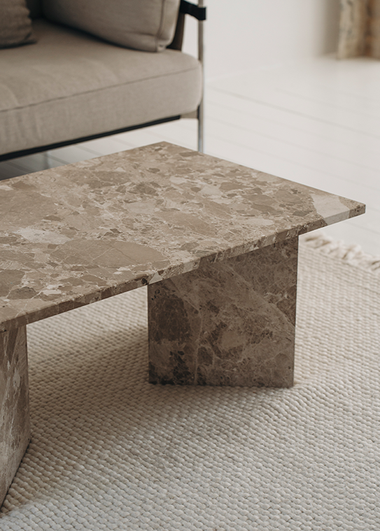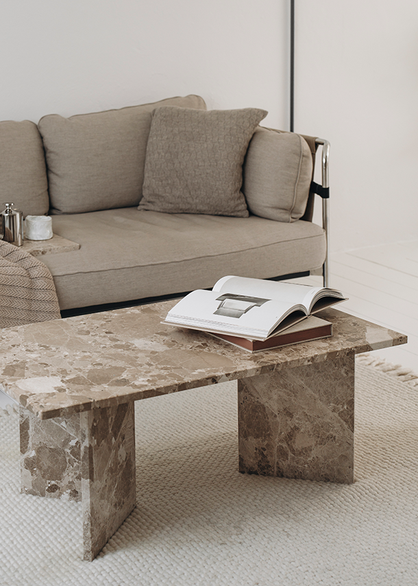 Dette bord er lavet i den smukke varmtonet Marrone marmor fra Europa. Stenens dynamiske spil af brunlige nuancer skaber et naturligt mosaiklignende udtryk.