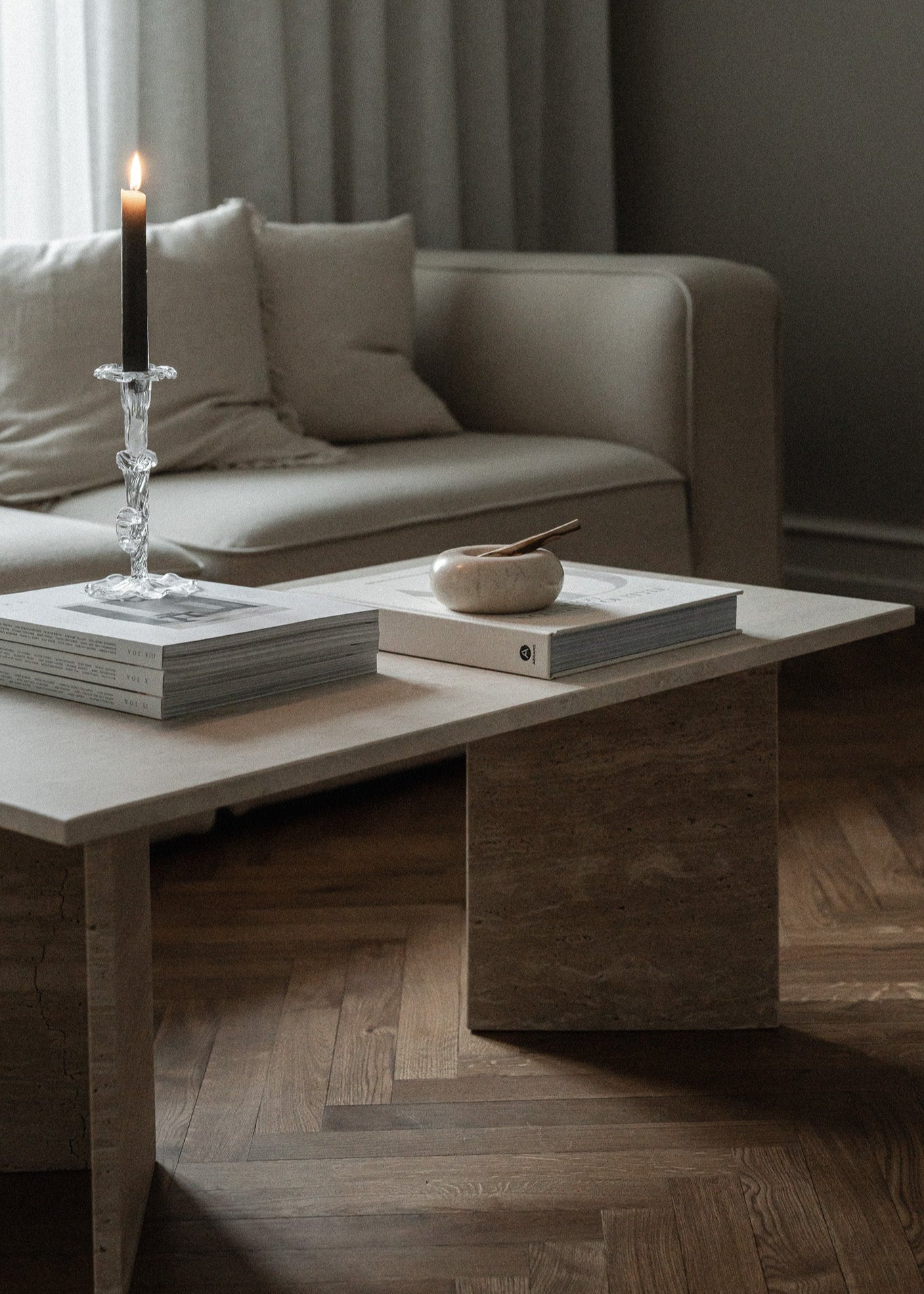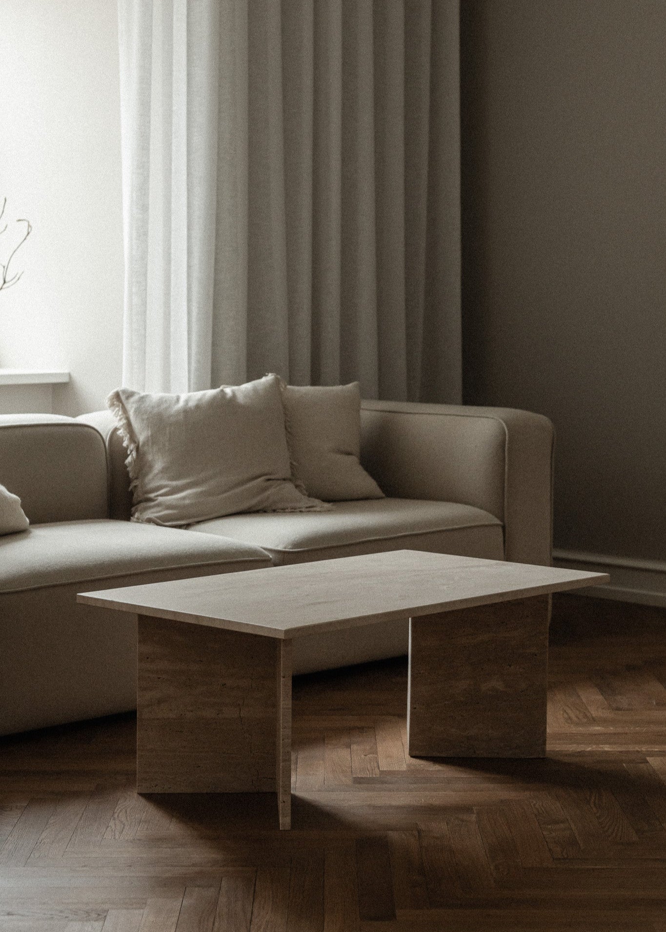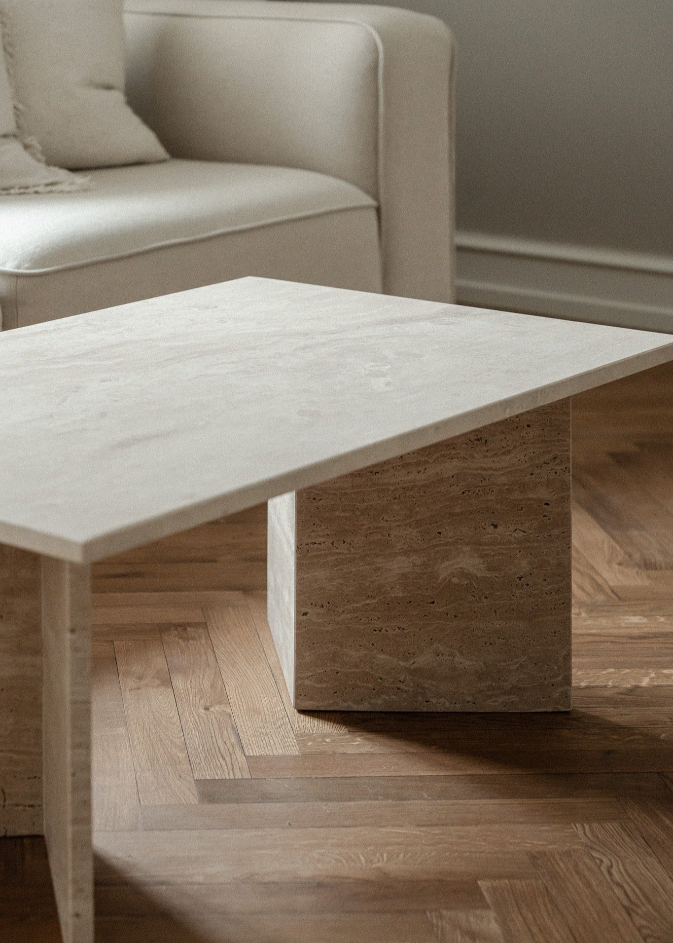 Bordpladen er behandlet, så den er glat og dermed nem at tørre af, mens sofabordets ben står i ærlig, eksklusiv, rå Travertin. Bordet er derudover imprægneret med en mat lak, der øger dets modstandsdygtighed i brug.