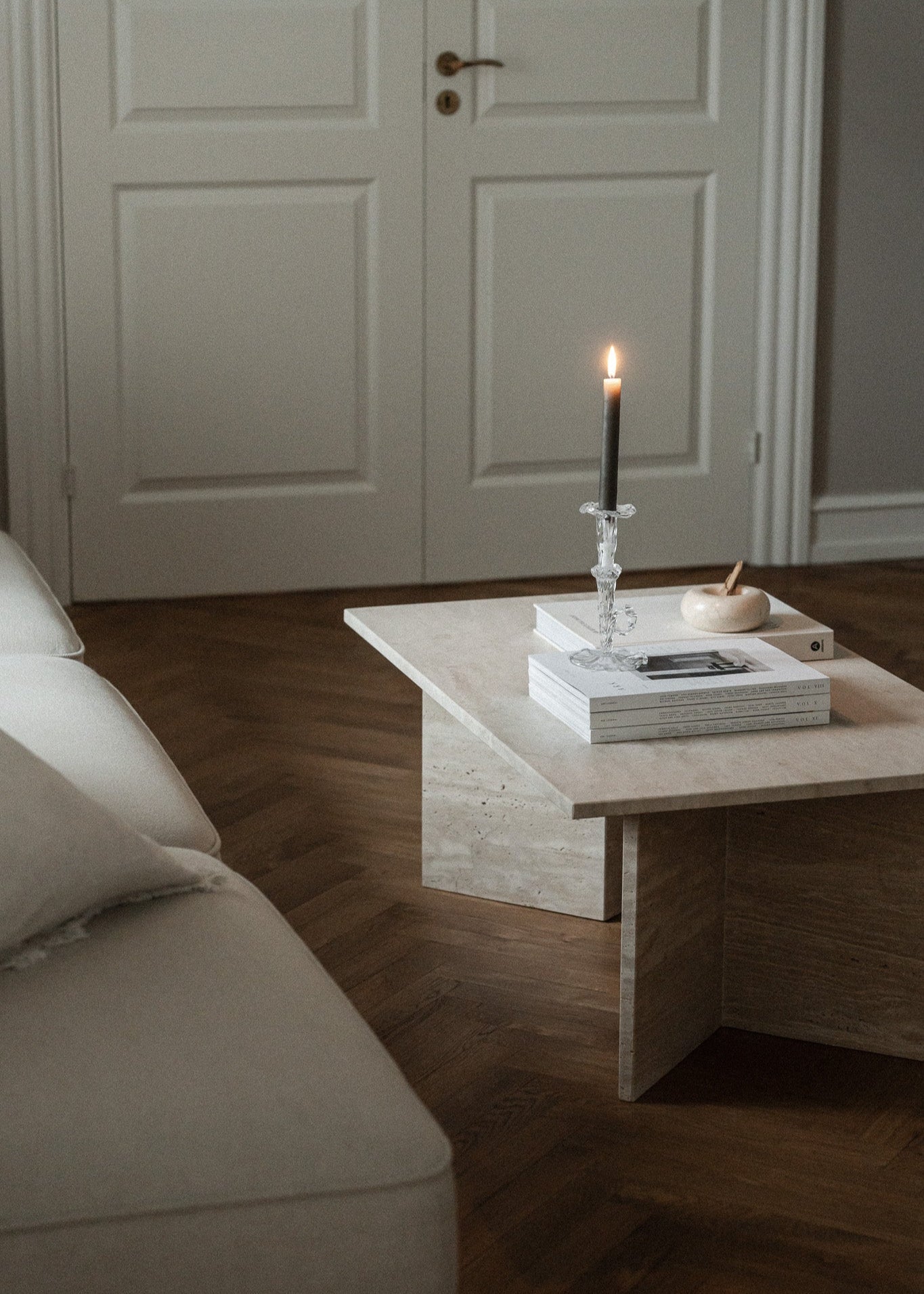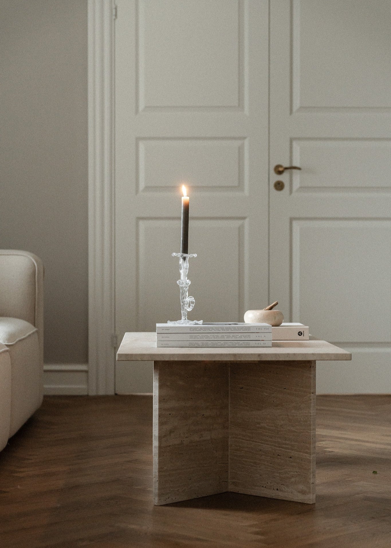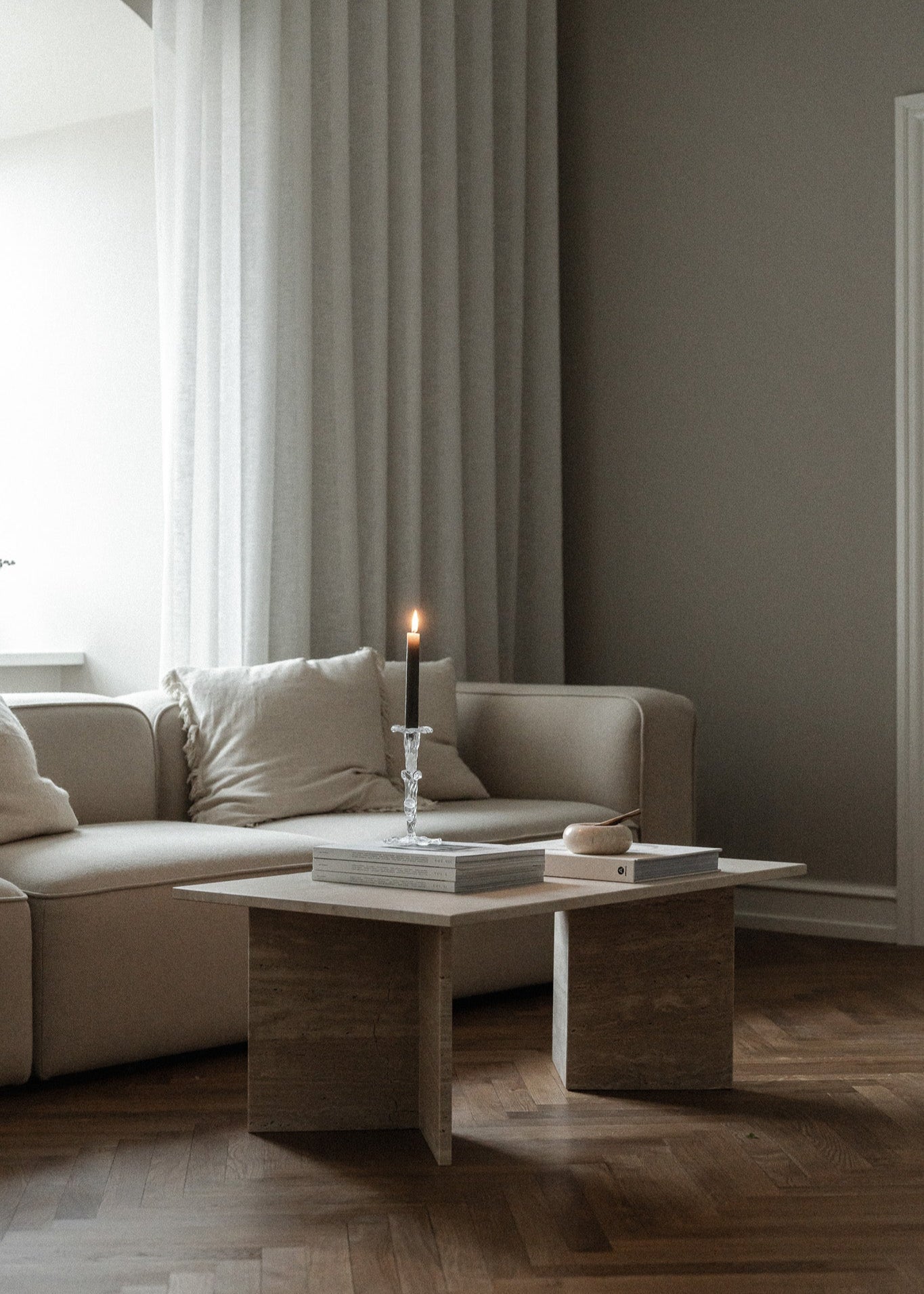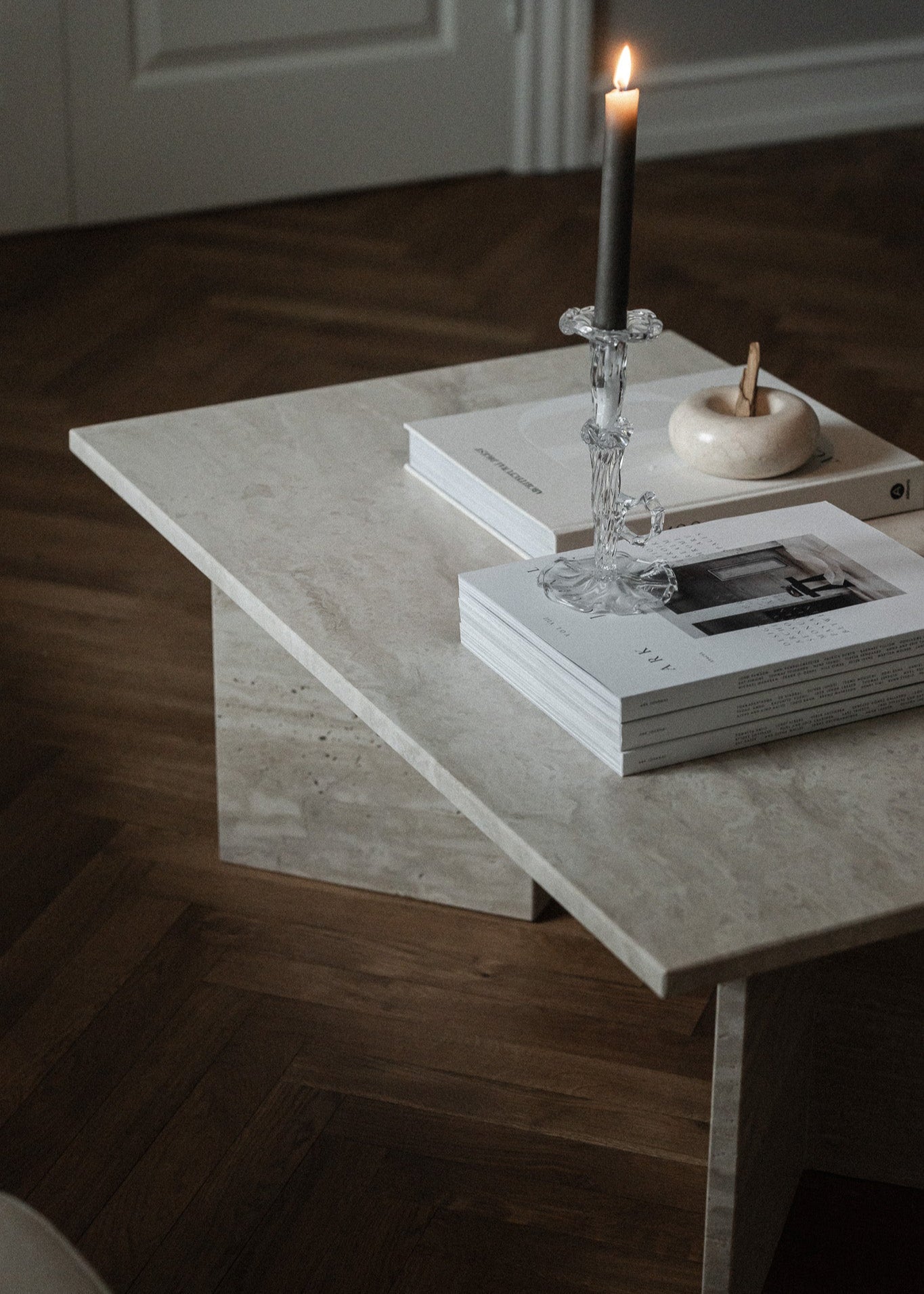 Bordpladen er behandlet, så den er glat og dermed nem at tørre af, mens sofabordets ben står i ærlig, eksklusiv, rå Travertin. Bordet er derudover imprægneret med en mat lak, der øger dets modstandsdygtighed i brug.
