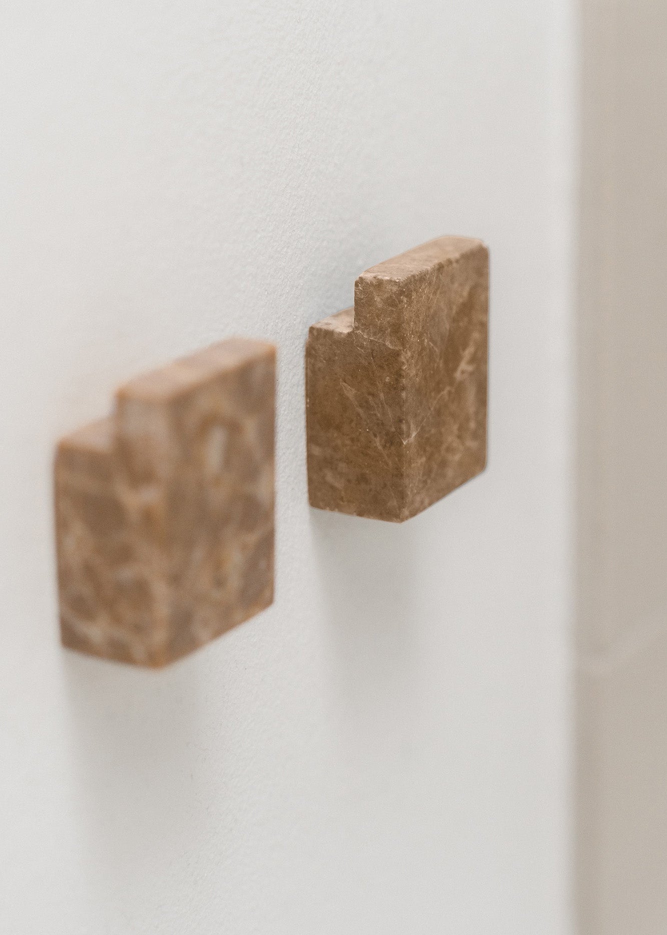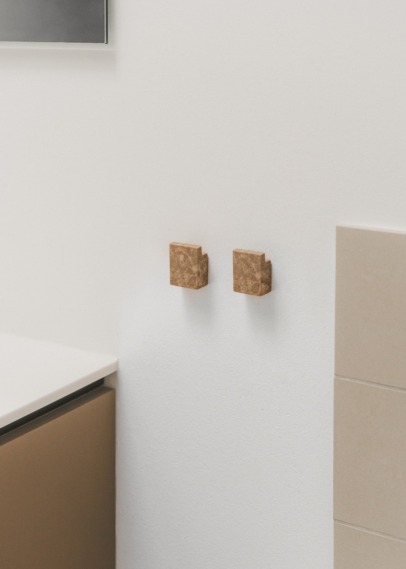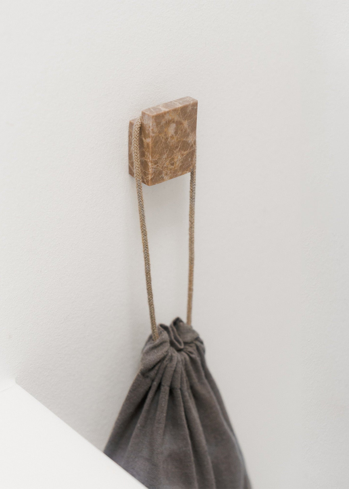 Øster er en lille serie af firkantede knager og greb i natursten. Det simple design sikrer en god funktionalitet, der passer ind i langt de fleste hjem. Brug dem på badeværelset til håndklæder, i køkkenet til viskestykker, eller i entréen til overtøjet.