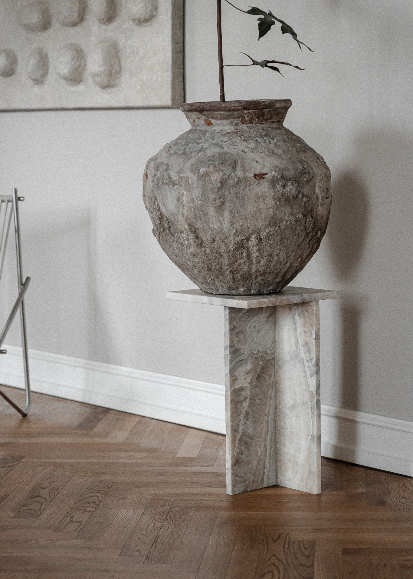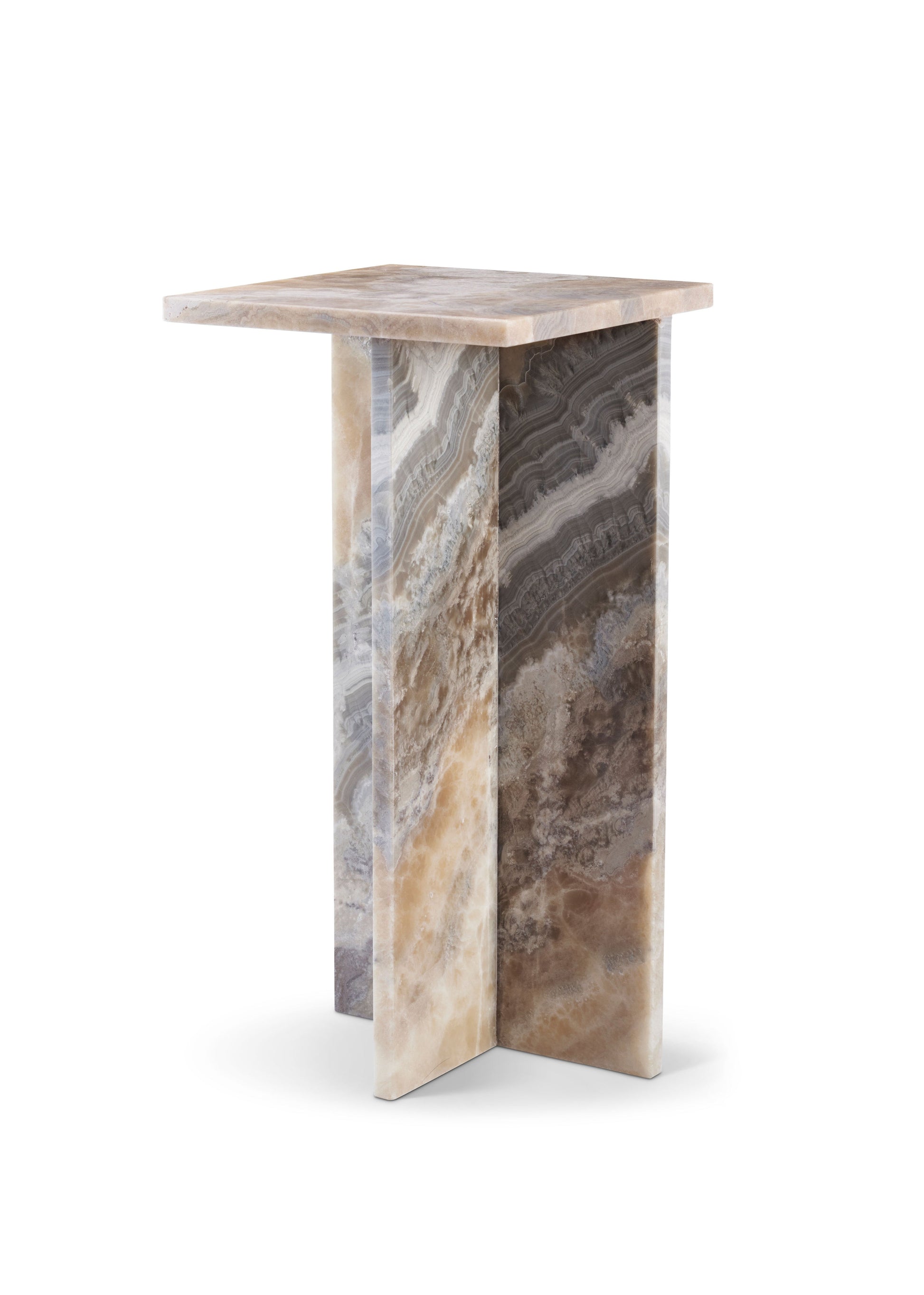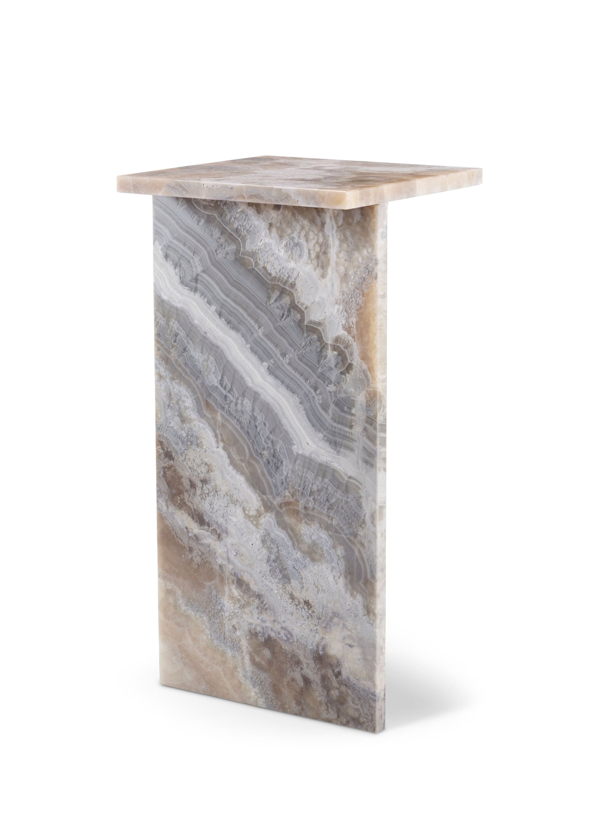 Denne piedestal er lavet i Alvera, som er en smuk, gylden onyx fra Europa. Når solens stråler gennemtrænger stenen, afsløres detaljer og vildtvoksende mønstre, der får stenen til at lyse op. Grundet Alvera stenens naturlige og smukke udtryk og variationer, vil hvert bord fremstå helt unikt.